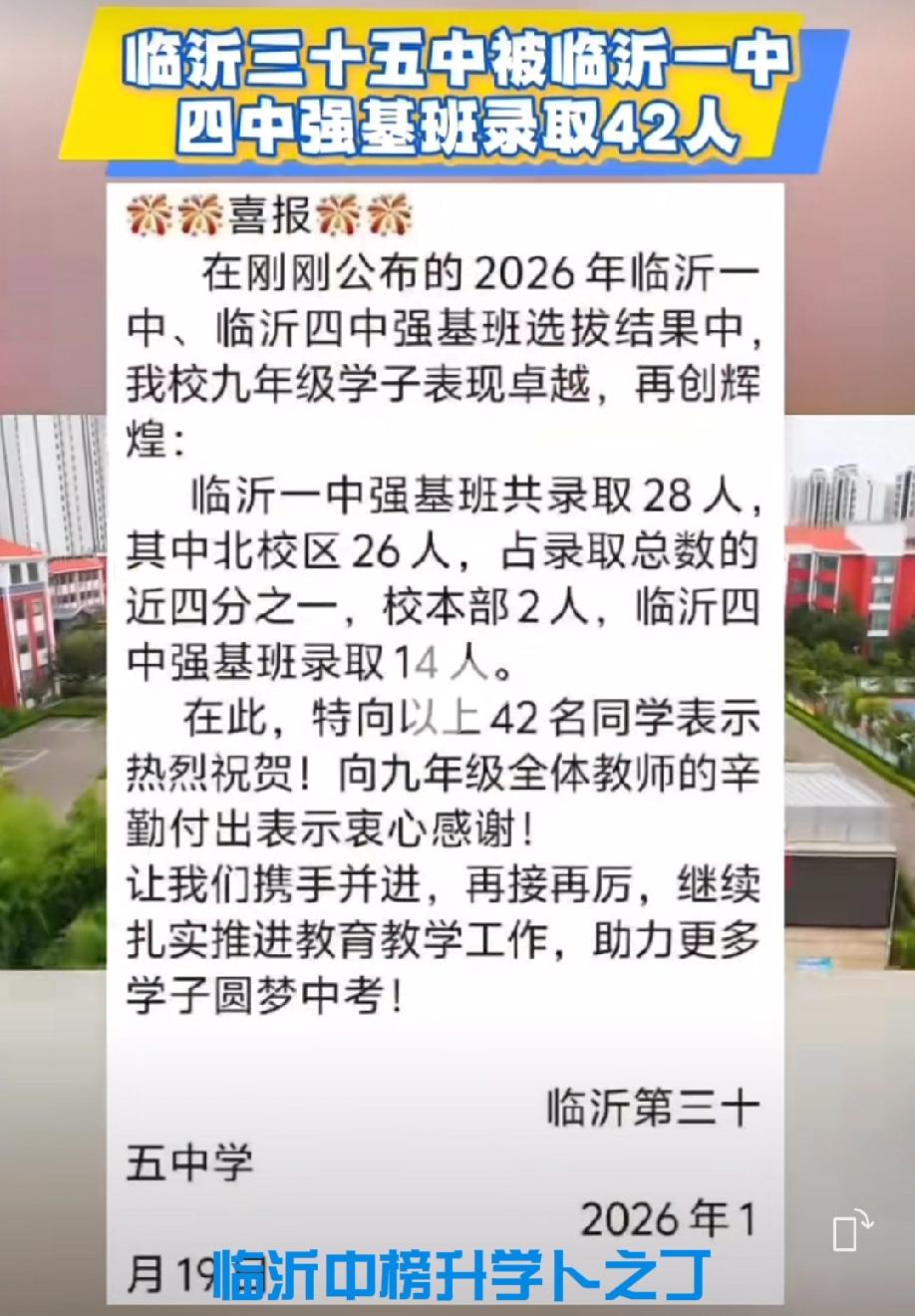 临沂兰山城区内的初中,老城区的六中、九中、十二中、沂州实验(铁中)都不错,南坊的三十五中,实验北教学质量挺好。从这次一中四中强基班录取人数来看,三十五中整体实力比较强。欢迎大家留言文明交流!