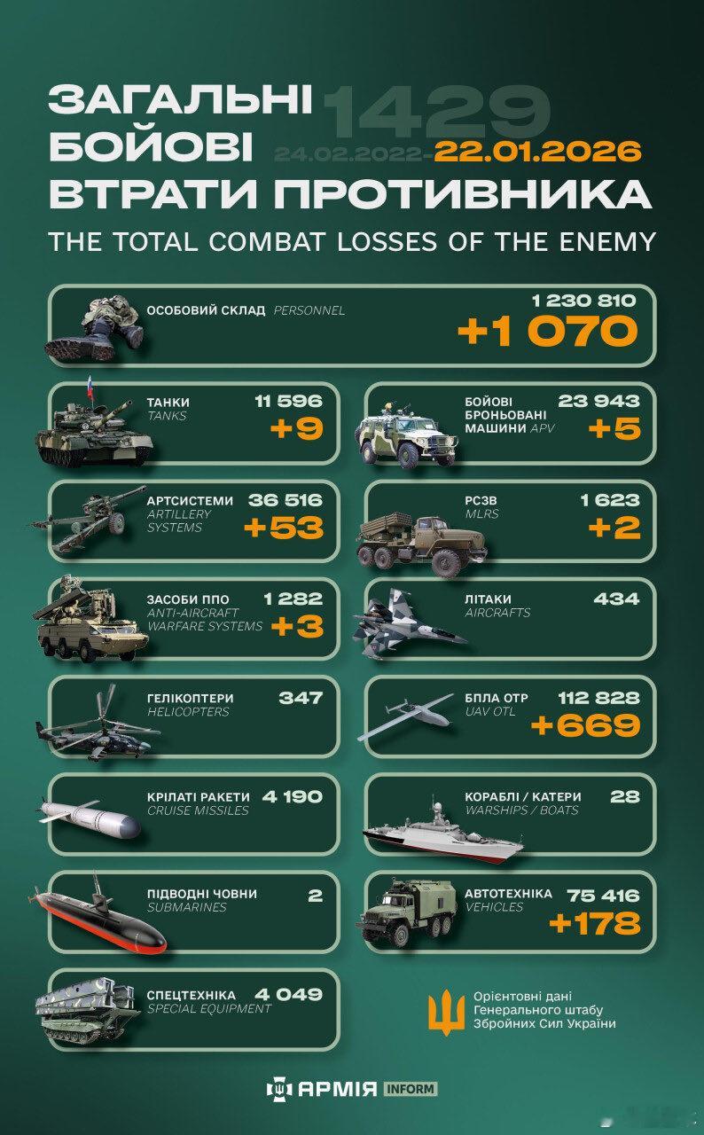 俄乌冲突 “世界第二军”俄罗斯只示范一次现代战争速度1小时22分又1429天乌克兰武装部队24小时又534天被驱逐出库尔斯克截至2026年1月22日“超级大国”俄罗斯损失战报约1230810头11596辆坦克23943辆装甲车36516门火炮1623门多管火箭炮1282套防空系统434架飞机 347架直升机112828架无人机4190枚导弹28艘军舰2艘潜艇75416辆汽车4049套特殊装备
