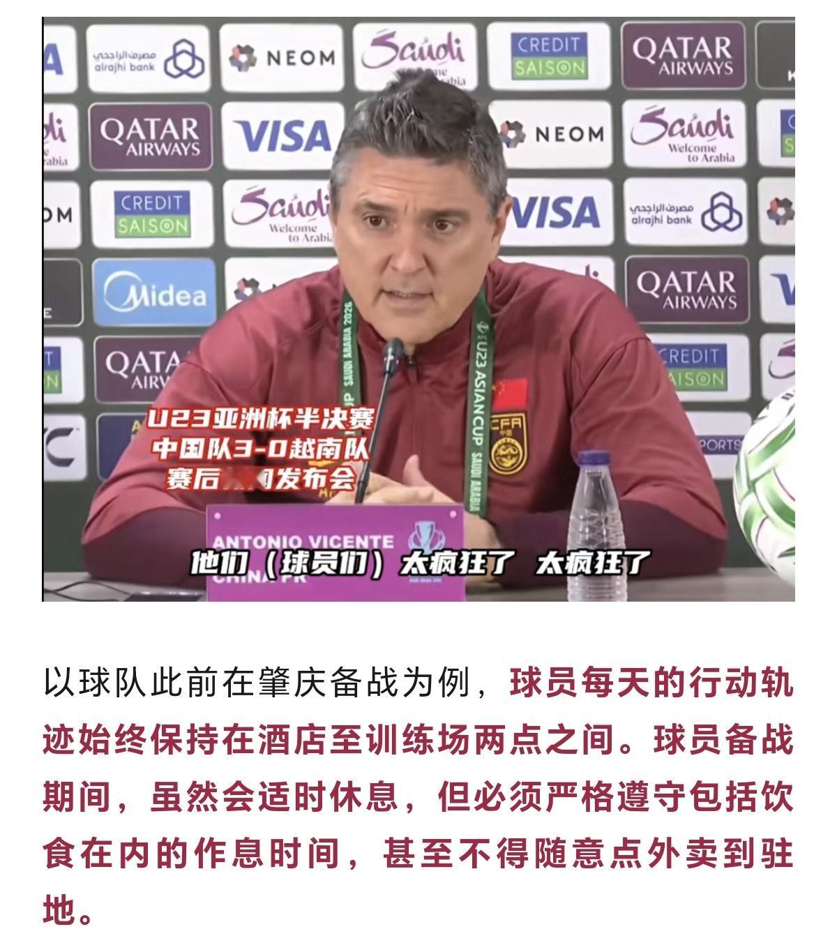 冲上热搜!U23国足主帅禁止球员随意点外卖。中国队3:0战胜越南队后,晋级决赛。谈及训练和饮食方面,主教练表示,平常球员都需要严格遵守,包括饮食在内的作息时间。甚至不得随意点外卖到驻地。 这个是常规操作,球员在比赛和训练时间,作息时间,饮食安排等,肯定都是有规定的,是不可以随意点外卖的。 来源:环球网