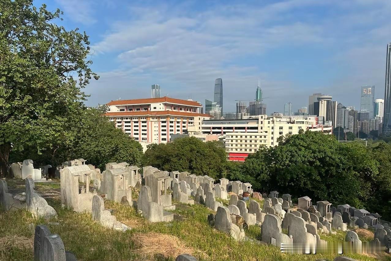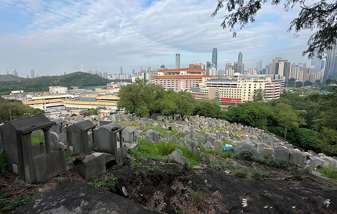 这应该是最靠近深圳繁华城区的坟场了。此处就是位于深圳罗湖口岸旁,香港一侧的山上的坟场,与深圳的距离就是一条河的宽度。当年,这里是香港最偏远的地区,而对面又是深圳最繁华的地方。这种鲜明对比形成了强烈的反差。