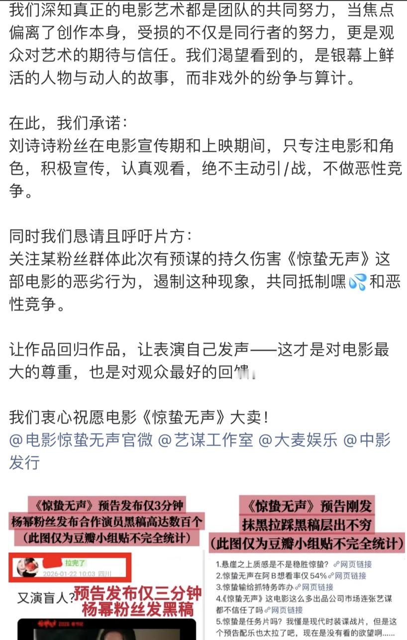 刘诗诗粉丝因电影惊蛰无声发倡议书了,斥责杨幂粉丝发黑通稿。