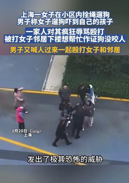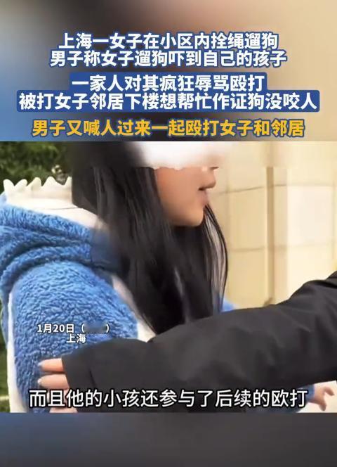 太嚣张了!上海一女子在小区内拴绳遛狗,男子称女子遛狗吓到自己的孩子,一家人对其疯狂辱骂殴打,被打女子邻居下楼想帮忙作证狗没咬人,男子又喊人过来一起殴打女子和邻居。 事情发生在1月18日,上海普陀区某小区内,26岁的女子牵着自家宠物狗,规范拴好牵引绳,在小区楼栋附近正常遛狗,全程小心翼翼,生怕打扰到邻里,狗狗也十分温顺,没有扑咬、狂吠的举动,安安静静地跟在女子身边。 就在这时,47岁的男子带着一家四口,正陪着孩子在楼栋门口等候电梯,女子牵着狗从电梯里出来,双方刚好偶遇。 没等女子反应过来,男子一家中的女性突然大叫一声,女子被这突如其来的叫声吓了一跳,而男子则瞬间脸色大变,上前拦住女子,声称她牵的狗吓到了自己的孩子,语气凶狠,满是戾气。 女子一脸错愕,连忙示意自己的狗很温顺,而且全程拴着牵引绳,根本没有靠近孩子,也没有做出任何吓人的举动,想要跟男子解释清楚。 可男子根本不听任何解释,也不给女子辩解的机会,当场就对着女子破口大骂,言语粗俗不堪,不堪入耳,一旁的家人也纷纷附和,围着女子不停辱骂,把女子围在中间,不让她离开。 辱骂声越来越大,吸引了周边不少住户的注意,女子被骂得浑身难受,只想尽快离开这个是非之地,可她刚转身想要走,男子一家就立刻追了上去,对着女子动手殴打。 几个人围着女子,拳打脚踢,下手毫不留情,女子被打得连连躲闪,身上多处受伤,面部也疑似有血迹,疼得蜷缩在地上,却依旧没能让对方停下动作。 期间,男子还特意报警,谎称女子的狗咬到了自己的孩子,试图颠倒黑白,将责任全部推到女子身上。 可小区内的监控,清晰地记录下了整个过程,监控画面显示,女子全程规范拴绳遛狗,狗狗没有任何扑咬小孩的举动,反而自始至终都十分温顺,是男子一家率先发难、辱骂殴打女子。 住在女子隔壁的28岁邻居,听到楼下的辱骂声和打斗声,连忙下楼查看情况,看到女子被一家人围殴,又得知男子谎称狗咬人,便主动站出来,想要帮女子作证,说明自己看到的真相,证明狗狗没有咬人,是男子一家无理取闹。 可邻居的好心,不仅没有制止这场暴力,反而引来了无妄之灾。男子看到有人出来作证,瞬间更加嚣张,当场拿出手机打电话,喊来自己的朋友,扬言要好好教训一下女子和多管闲事的邻居。 没过多久,男子喊来的人就赶到了现场,几个人汇合后,不分青红皂白,对着女子和邻居一起殴打。 邻居被击打面部,口腔内侧出血,下颌也肿了起来,疼得说不出话,女子则被打得浑身是伤,蜷缩在地上不停发抖, 狗狗也遭到了对方的多次踢踹,却始终没有反抗,依旧温顺地守在女子身边。男子一行人一边殴打,一边疯狂威胁辱骂,甚至扬言要杀掉女子的狗,态度嚣张到了极点。 周边住户见状,纷纷不敢上前阻拦,只能悄悄拍下现场画面,帮忙报警求助。警方接到报警后,迅速赶到现场,制止了这场暴力冲突,将涉事人员全部带回派出所调查, 同时委托专业机构,对男子、女子和邻居三人的受伤情况开展伤情鉴定,目前已经依法行政立案,后续将根据调查情况依法作出处理。 1月21日,被打邻居发布视频,曝光了这件事的始末,讲述了自己帮忙作证却被殴打的经历,同时透露警方已经立案处理, 视频一经发布,很快就怒炸全网,引发了无数网友的关注和热议,大家纷纷谴责男子一家的嚣张行径,对被打的女子和邻居表示心疼。 女子平时在小区内遛狗,一直都十分规范,都会拴好牵引绳,避开老人和小孩,从来没有发生过类似的纠纷,狗狗也有正规的狗证,一直都很温顺。而男子一家平时在小区内的口碑就不算好,经常因为一点小事就与人发生争执,态度十分蛮横。 女子和邻居经过治疗,目前伤情已经趋于稳定,正在家里休养,对于这场突如其来的暴力,两人依旧心有余悸。 对此,你们有什么看法,欢迎评论留言~
