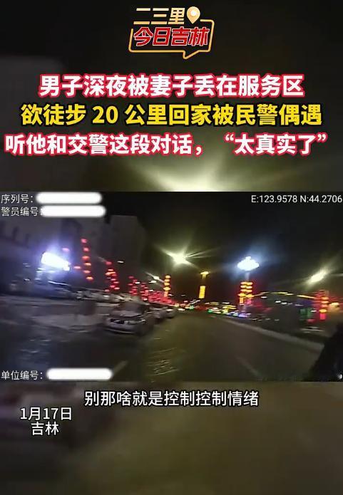 "太真实了!"1月17日吉林,男子深夜被妻子丢在服务区欲徒步 20 公里回家被民警偶遇,得知男子和媳妇吵架了后,民警还特意叮嘱男子一定要控制好情绪! 1月17日晚上8点左右,吉林长岭的高速服务区附近,当天夜里的气温低到零下30度,寒风刮在脸上跟刀子割似的。 黑灯瞎火的高速路上,车流虽然不算密集,但偶尔过往的车辆,也给行人带来了极大的安全隐患,这样的天气,这样的路段,没人愿意在户外多待一秒钟。 就在这样恶劣的环境下,高速民警例行巡查时,突然发现应急车道上有一个孤单的身影在慢慢行走,身影单薄,步伐有些沉重,时不时还会搓搓手、跺跺脚,看得出来,已经被冻得不行。 民警见状,立刻放缓车速,上前查看情况,生怕男子发生意外,毕竟零下30度的深夜,徒步在高速上,不仅容易冻伤,还可能被过往车辆撞到。 民警停车后,连忙招呼男子上车避寒,男子一开始还有些不好意思,犹豫了一下才拉开车门坐了进去,一上车就忍不住搓着冻得僵硬的双手, 脸颊和耳朵冻得通红,嘴里还不停念叨着“真冷”。民警赶紧把车内空调暖风开到最大,又递给男子一杯热水,让他先暖暖身子,缓解一下寒冷。 等男子稍微缓过劲来,民警才慢慢询问起事情的来龙去脉,这才知道,男子是长岭本地人,当天和妻子一起从长春回来, 路上两人因为一点小事吵了起来,越吵越凶,妻子一时气不过,走到服务区的时候,直接把男子推下了车,自己开车扬长而去,丝毫没有顾及男子的安危。 男子被丢下后,又生气又无奈,手机也刚好没电了,联系不上妻子,也联系不上其他家人,没办法,只能想着徒步回家。 他打听得知,从这个服务区到自己家,大概有20公里的路程,虽然知道路途遥远,天气又冷,还很危险,但他实在没有别的办法,只能硬着头皮往前走,哪怕冻得浑身发抖,也只能咬牙坚持。 期间,还有交警路过,也停下车辆询问男子的情况,男子和民警、交警的交流格外真实,没有丝毫掩饰自己的委屈和无奈, 一边说着和妻子吵架的经过,一边吐槽自己的无奈,语气里满是心酸,却又带着一丝东北老爷们的倔强,不抱怨妻子的狠心,只是一个劲地说“没事,吵完就好了”。 民警和交警听完后,没有过多指责,只是耐心地安抚男子的情绪,还特意叮嘱他,夫妻之间吵架很正常,哪有舌头不碰牙的, 但不管吵得多凶,都要控制好自己的情绪,不能意气用事,更不能拿自己的安全开玩笑,高速上徒步极其危险,而且这么冷的天气,长时间待在户外,很容易被冻伤,甚至引发更严重的问题。 当天吉林长岭正处于极寒天气预警中,深夜最低气温达到零下30度,这样的气温下,人体在户外待上半小时,就可能出现严重冻伤, 要是真的徒步20公里回家,估计没走到一半,就会被冻得失去知觉,后果不堪设想,还好民警偶遇及时,及时救下了男子,避免了意外的发生。 男子听完民警和交警的叮嘱,连连点头,表示自己知道错了,以后和妻子吵架,一定会控制好自己的情绪,不会再拿自己的安全开玩笑,也会好好和妻子沟通,化解两人之间的矛盾。 民警见男子情绪渐渐平复,又确认了他家里的地址,决定亲自开车,把男子安全送到家楼下,避免他再出现任何意外。 其实,夫妻之间难免会有矛盾和争吵,生气归生气,吵架归吵架,但无论如何,都不能意气用事,把对方独自遗弃在高速服务区这种危险的地方,尤其是在零下30度的极寒天气里,这种行为不仅不顾及对方的安危,还可能引发不可挽回的后果。 男子和民警、交警的交流,没有华丽的言辞,却格外真实,道出了很多夫妻吵架后的无奈与心酸。对此,你们有什么看法,欢迎评论留言~