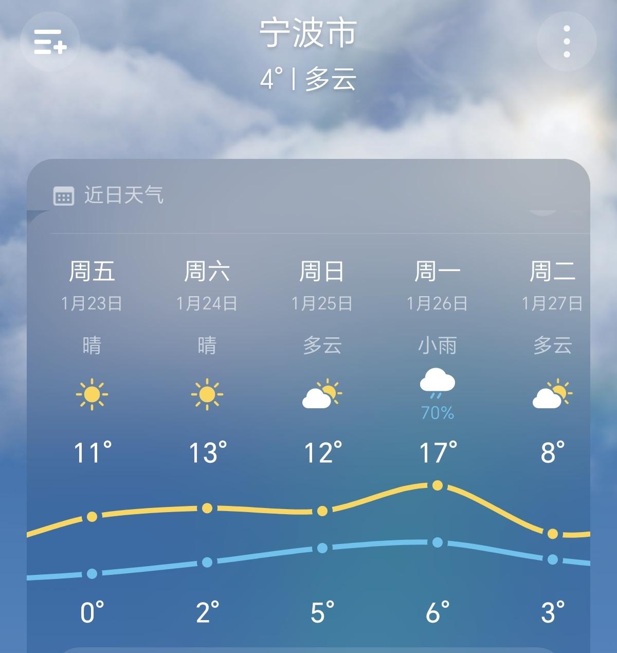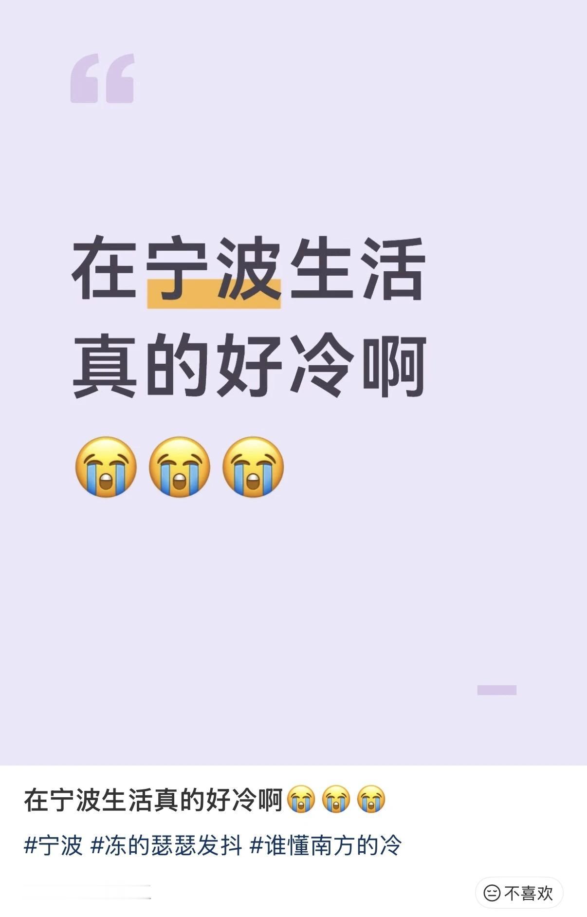 有网友感慨,在宁波生活真的好冷!这两天是挺冷的,特别是早上出门的时候,北风一吹,有点涉涉发抖。好在大衣还算保暖,紧了紧衣服,总体来说,倒也能忍受。 一旦气温跌到零下,达到霜冻的级别。在北风的加持下,就算是在市区,走在街道上,也还是很冷的。不过,再等两天,气温就会有所回升,霜冻天气会结束。到时候,走在街道上,应该就不会冻的涉涉发抖了。 素材来源:宁波晚报 宁波身边事