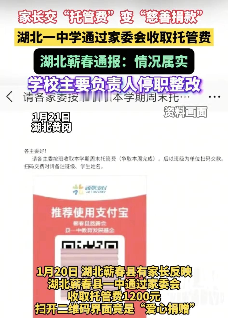 湖北黄冈一中学有家长反映,学校通过家委会收取1200块的托管费用,但是在群里打开二维码,发现竟然显示的是爱心捐赠费用。有关部门已经核查情况属实,对主要负责人进行停职处理,并把收取的费用原路退回家长的账户中。不少城市已经开放了放学延迟的托管服务,而且这些延迟托管服务全都是免费的,不仅有老师辅导作业,也有不少的兴趣班,可以供学生们选择。