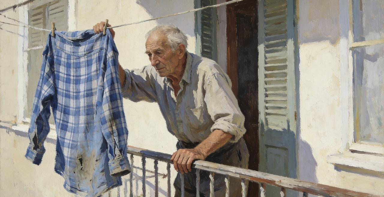 昨天路过老邻居张伯家阳台,看见他正颤巍巍地晾一件衬衫——那件褪色的蓝格子衬衫,在