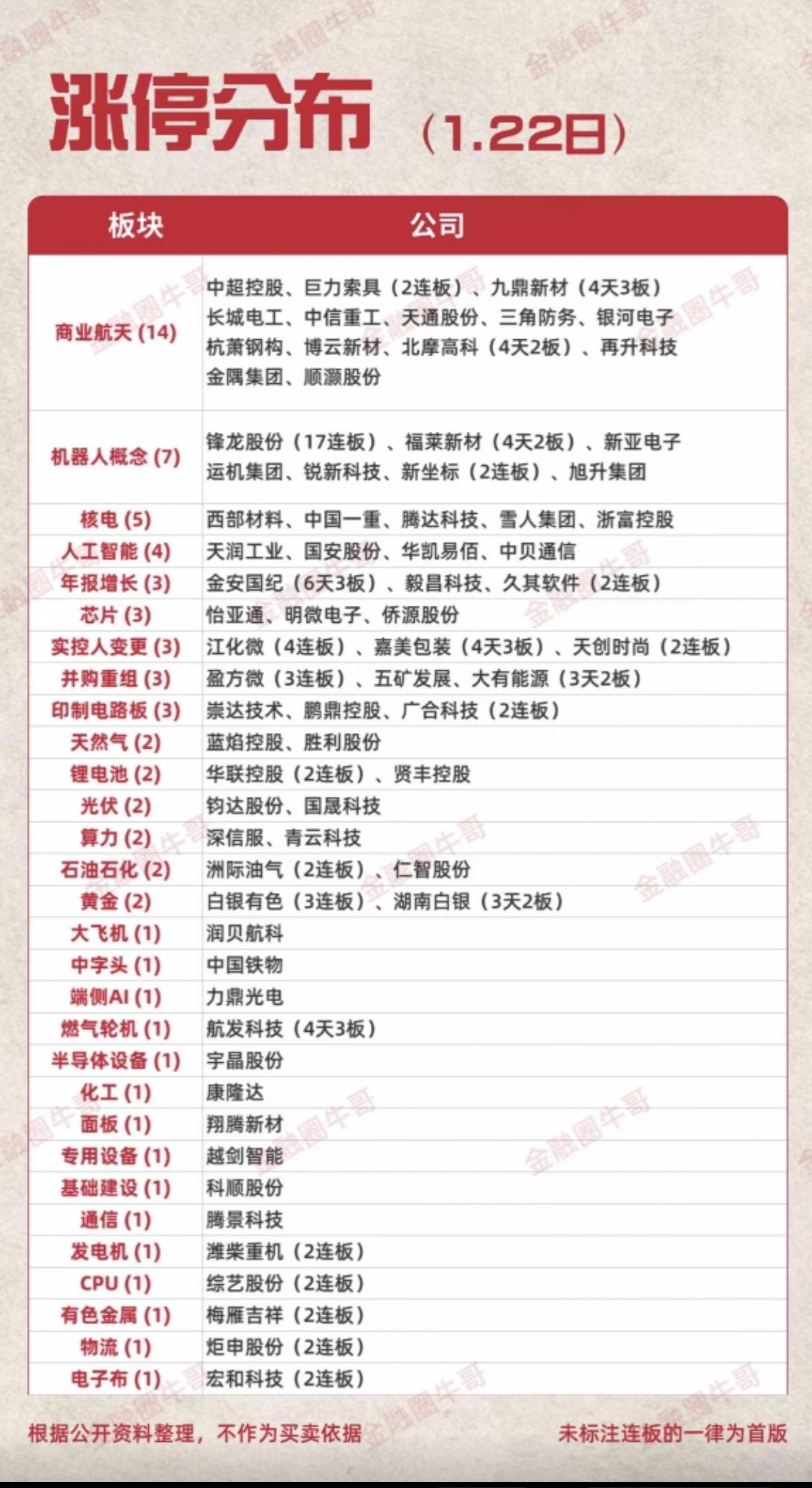 1.22周四 涨停板股票:题材+高度! 机器人 锋龙股份17板 市场热点方向:核电+航天+年报预增 商业航天 14股涨停 机器人 7股涨停 核电核能 5股涨停 人工智能 4股涨停 半导体芯片 3股涨停