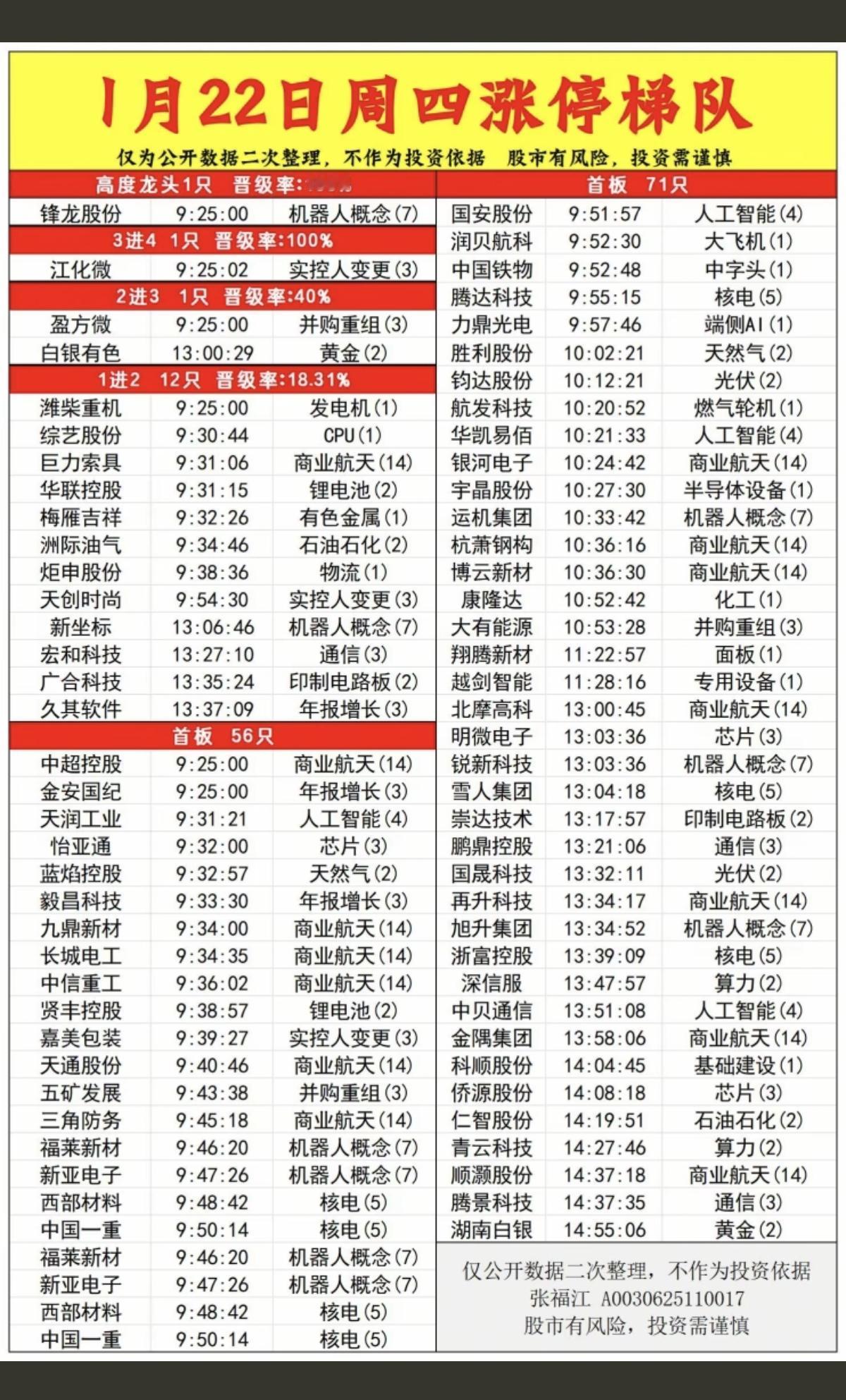 1.22周四 涨停板股票:梯队+高度! 商业航天再次活跃 年报业绩预增 十七板 锋龙股份 四连板 江化微 三连板 盈方微 白银有色