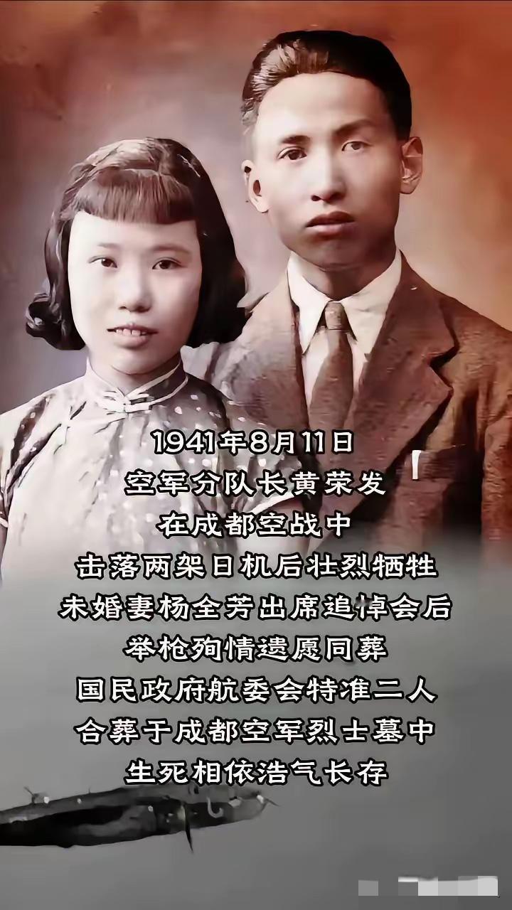 1941年8月11日,空军分队长黄荣发在成都空战中击落两架日机后壮烈牺牲。未婚妻杨全芳出席追悼会后举枪殉情,遗愿同葬。国民政府航委会特准二人合葬于成都空军烈士墓中,生死相依,浩气长存。 很少有人知道,这位空战英雄本是广东台山的富家子弟黄荣发曾就读于复旦大学附中和杭州国立艺术专门学校,后投笔从戎,考入空军军官学校第八期。毕业后被分配至中国空军第五大队第二十九中队,担任分队长。在1941年8月11日的成都空战中,他驾驶战机,却选择驾着性能悬殊的伊-153战斗机,直面日军先进的零式战机。1941年的成都早已被战火笼罩,半个月前的7·27惨案中,108架日机投下426枚炸弹,盐市口、春熙路沦为焦土,875名同胞葬身火海,这样的惨剧让每一位飞行员都抱着必死的决心升空。 黄荣发放弃优渥生活投身报国,并非一时冲动。当时的中国空军力量薄弱,战机数量不足日军十分之一,且多为老旧机型。据史料记载,1941年中国空军现役战机仅300余架,而日军仅在华作战飞机就超800架,实力差距悬殊。 他在杭州国立艺术专门学校时,擅长绘画与音乐,本可成为一名艺术家。但看到国土接连沦陷、同胞惨遭屠戮,他毅然放弃画笔,拿起操纵杆。入学空军军官学校后,他训练格外刻苦,射击、格斗、战术演练成绩始终名列前茅,毕业后迅速成长为中队骨干。 1941年8月11日清晨,日军18架零式战机突袭成都上空。警报响起时,黄荣发刚结束夜间值班,还未来得及吃早饭,便立刻冲向战机。伊-153战斗机最大时速仅360公里,而零式战机时速达533公里,且火力更强、机动性更优,在空战中处于绝对劣势。 空战打响后,黄荣发驾驶战机灵活穿梭于敌机群中。他凭借精湛的驾驶技术,避开日军多次攻击,找准时机连续开火,首架日机冒着黑烟坠毁在成都郊外农田。紧接着,他又锁定另一架敌机,在弹药即将耗尽时,毅然驾机逼近,用机翼撞向敌机尾翼,迫使敌机失控坠毁,自己的战机也因受损严重开始摇晃。 就在他准备返航时,三架日机突然从背后袭来,密集的子弹击中战机座舱。黄荣发身负重伤,却仍死死握住操纵杆,试图将战机迫降在安全区域,最终因伤势过重,战机坠毁在锦江岸边,年仅24岁。 杨全芳与黄荣发自幼相识,两人早已定下婚约,约定等抗战胜利后就结婚。得知黄荣发牺牲的消息时,她正在上海一所小学教书,连夜赶去成都。追悼会上,看着灵堂中黄荣发的遗像,她强忍着悲痛,向亲友深深鞠躬,随后在休息室取出提前准备好的手枪,轻声说“我来陪你了”,便扣动了扳机。 他们的故事传遍成都,百姓自发来到烈士墓前献花。国民政府为表彰黄荣发的英勇事迹,追授他“空军烈士”称号,颁发“青天白日勋章”,并将他的家乡台山某街道命名为“荣发路”,以此缅怀这位年轻的英雄。 如今,成都空军烈士墓依旧静静矗立在城郊,墓碑上黄荣发与杨全芳的名字紧紧相依。每年清明,都有市民、学生前来祭扫,聆听他们的故事,感受那段烽火岁月里的家国情怀与忠贞爱情。 这样的英雄故事,不该被历史遗忘。黄荣发用生命诠释了“国家兴亡,匹夫有责”,杨全芳用深情谱写了乱世中的爱情绝唱。他们的精神,如同暗夜中的星光,指引着后人铭记历史、珍惜当下,为国家的繁荣富强而努力。 麻烦看官老爷们右上角点击一下“关注”,既方便您进行讨论和分享,又能给您带来不一样的参与感,感谢您的支持! 各位读者你们怎么看?欢迎在评论区讨论。