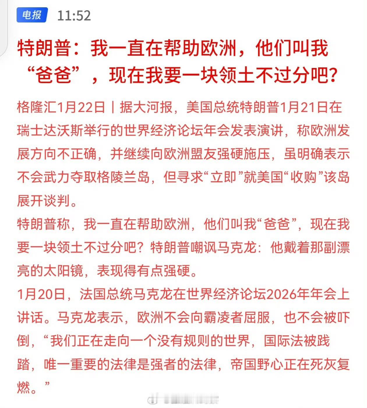 特朗普:我一直在帮助欧洲,他们叫我“爸爸”,现在我要一块领土不过分吧?