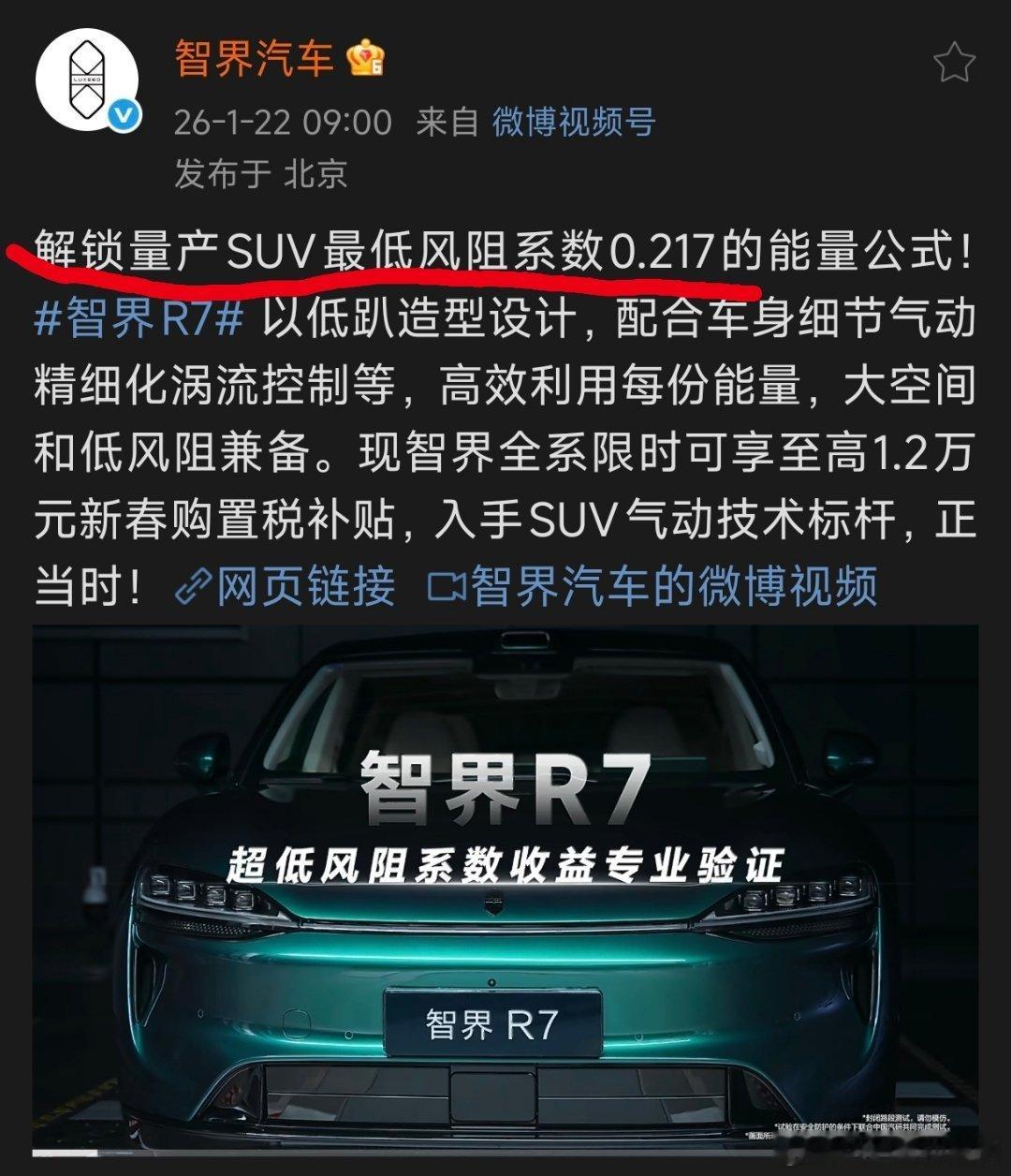 智界R7创全球量产SUV最低风阻纪录是不是搞错了?R7是0.217而Model YL是0.216