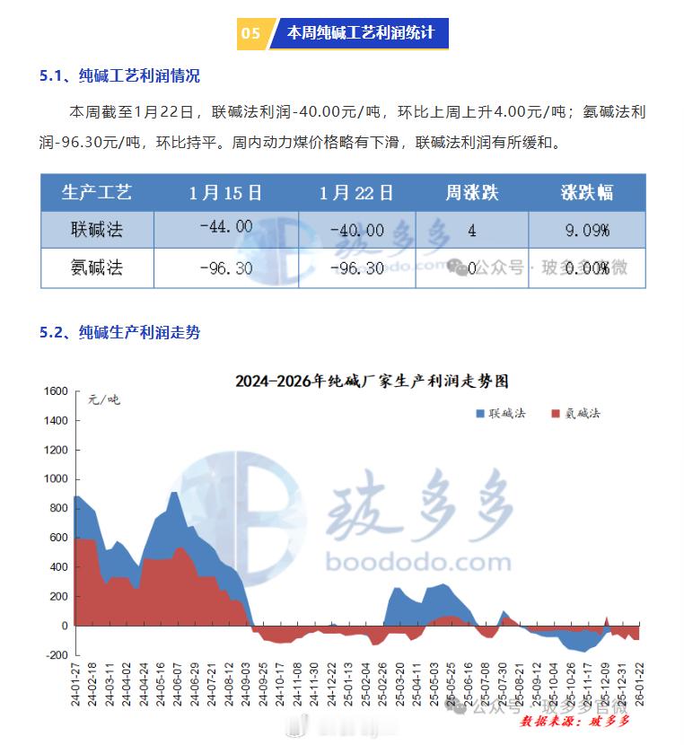 本周截至1月22日,联碱法利润-40.00元/吨,环比上周上升4.00元/吨;氨碱法利润-96.30元/吨,环比持平。周内动力煤价格略有下滑,联碱法利润有所缓和。纯碱期货