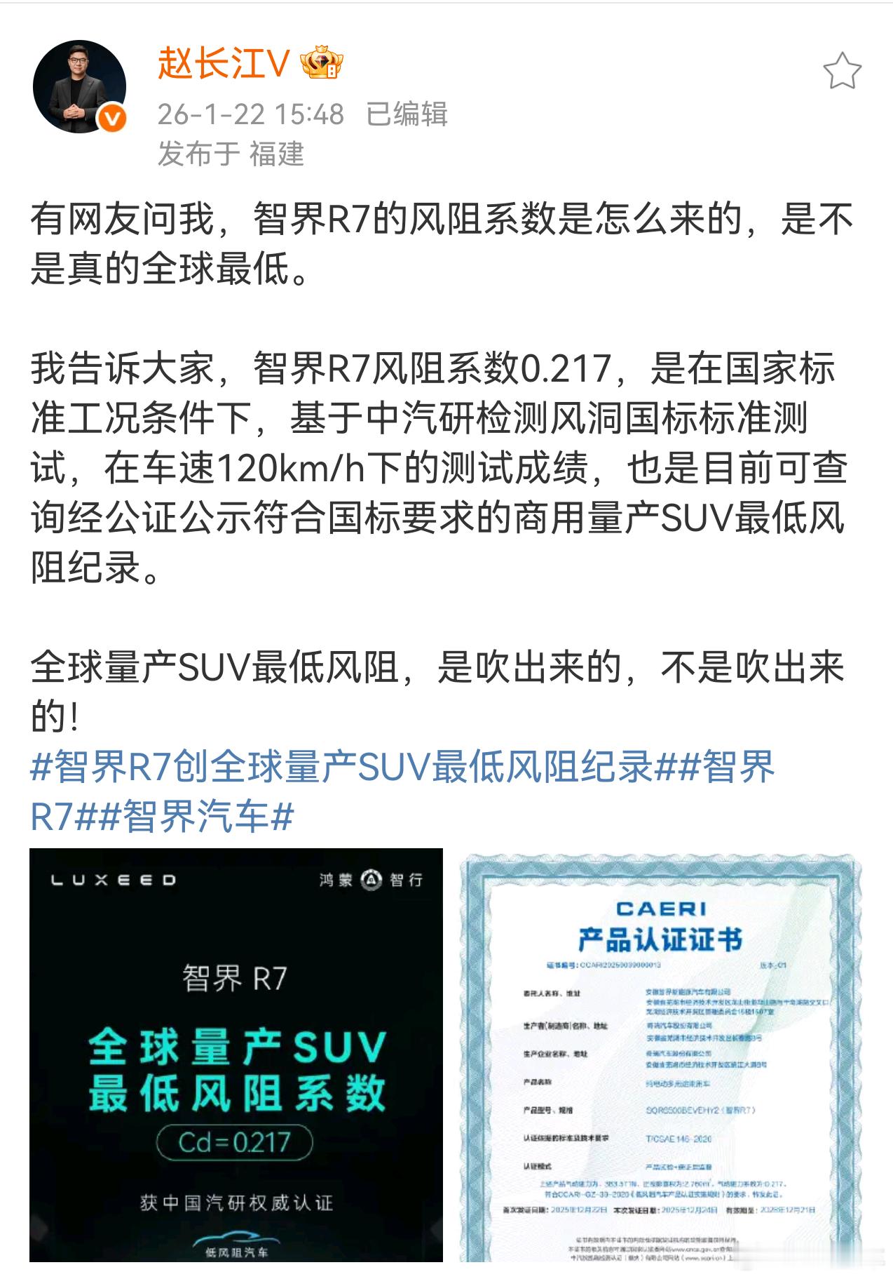 赵长江回应智界R7全球最低风阻 建议新建一个词条:「赵长江不再低调」