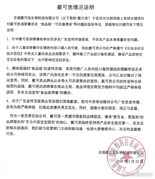 #当地称对戴可思立案调查#【宣称儿童唇膏“食品级”被立案调查!戴可思致歉】#戴可思宣称儿童唇膏食品级被立案调查##戴可思致歉#近日,郭晶晶、刘涛代言的婴童护理品牌“戴可思”被曝一款儿童唇膏宣称为“食品级润唇膏”,涉嫌违反《儿童化妆品监督管理规定》。针对此事,1月22日,戴可思官方发布致歉声明称,“食品级”的宣传用语为公司推广人员对“经口毒性测试”的理解有误且未经公司审核,公司已及时撤回了相关宣传。1月22日,戴可思创始人张晓军向南都湾财社记者表示,此次争议不涉及产品质量问题。1月22日,无锡市新吴区市场监管局宣传科向南都湾财社记者表示,该局已于近日对戴可思进行立案调查。