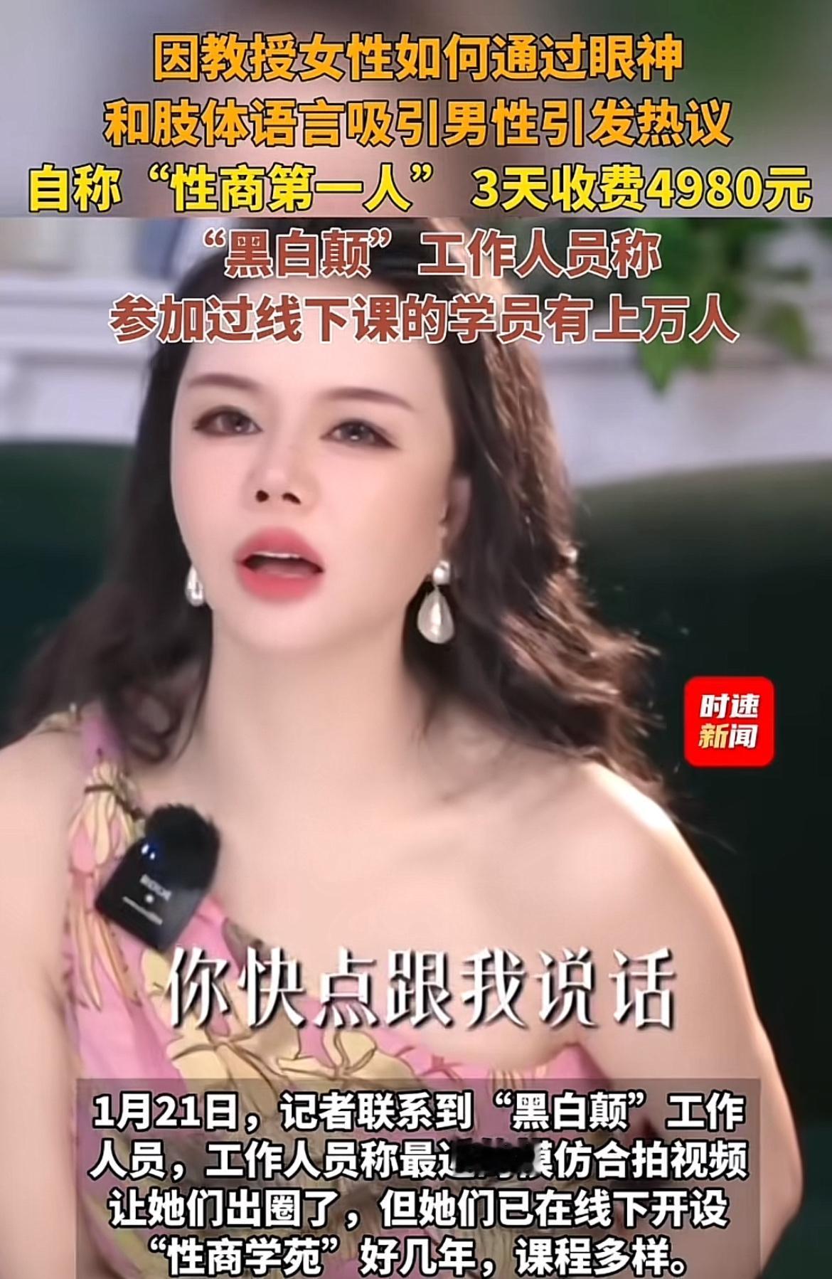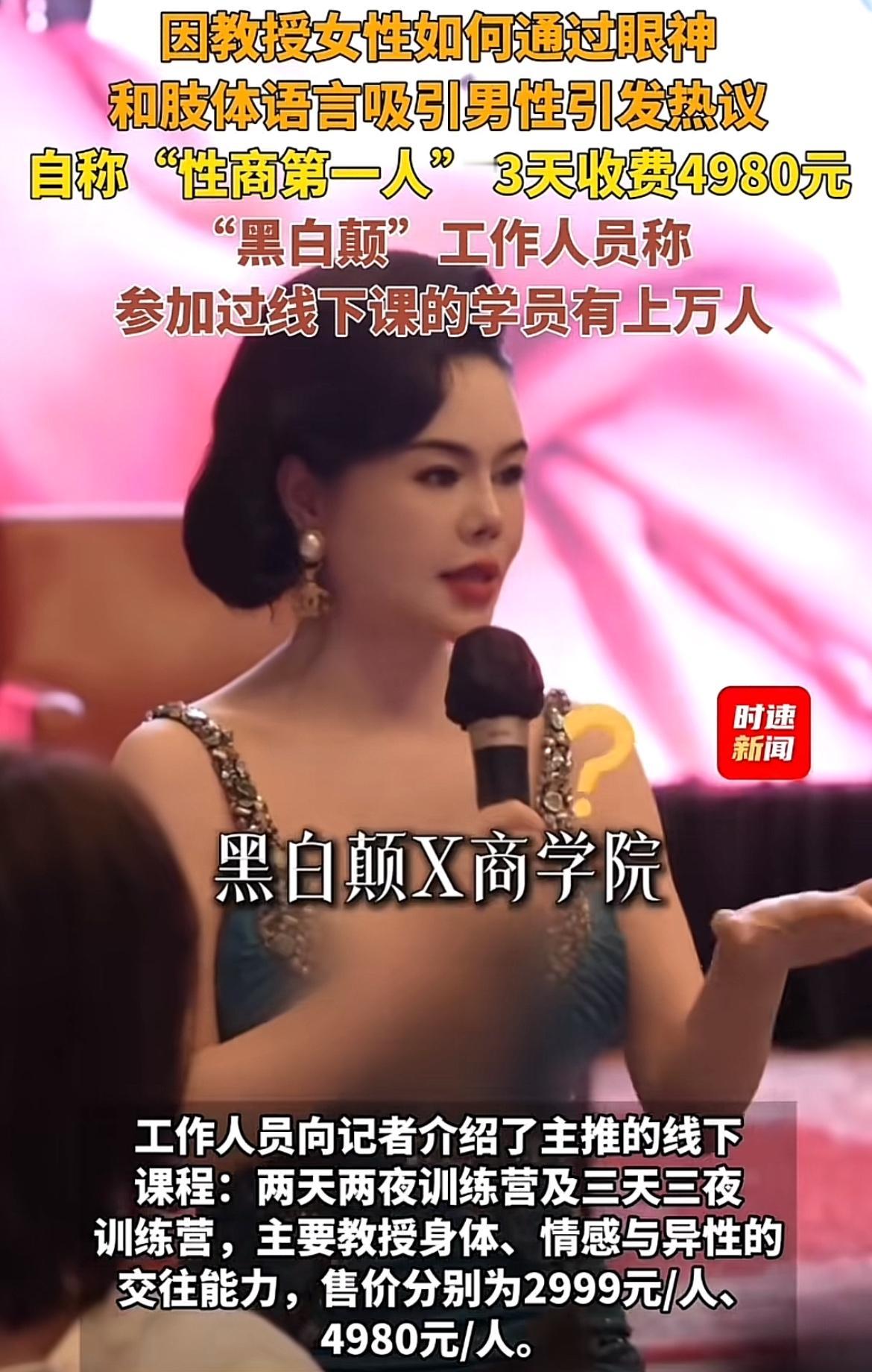 最近“黑白颠X商学院”火了,3天收费4980元,引得男性热议。背后的“黑白颠周媛”更是个话题人物。她自称“性商第一人”“中国性商教母”,在社交网络走红。 她打造了一个营销矩阵,有999元线上课传授“情趣玩法”,4980元线下营演练“肢体语言”,还有最高8.8万元的导师班,捆绑“美业医疗”“轻创业扶持”等。据不完全统计,官方商城付费课程收入超2400万,累计学员达数万人。虽说她称课程是为让女性在亲密关系里取悦自己,但部分画面尺度大,还曾被误解为“小三培训班”。这高昂收费的课程,到底价值几何,真得打个问号。