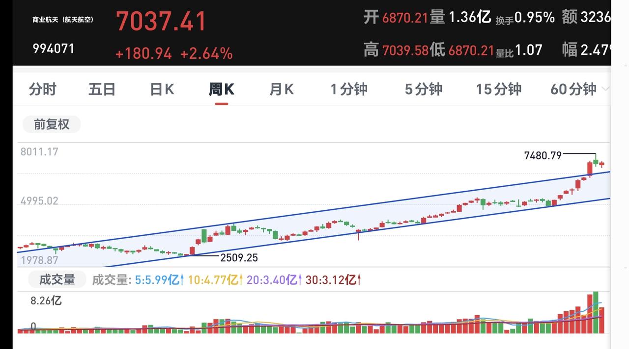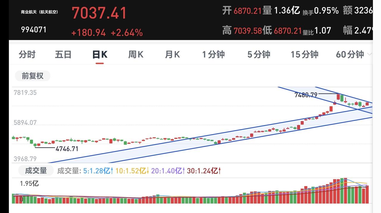 基金:商业航天板块应该怎么办 今天市场高开以后,震荡震荡的幅度非常小,开盘的时候4126点,收盘的时候4122点,全天只下跌了4个点,收盘的时候五天线位置是4113点,收在五天线之上。 今天上涨3500多家,下跌1700多家,涨停95家,跌停6家,接近于百股涨停,今天两市累计成交26917亿,相比于昨天放量了4%,主力资金净流出232亿,今天主力资金净流入最多的三个板块是:通信板块,5G板块,通信设备板块,主力资金净流出最多的三个板块是:蓝筹策略板块,高端制造板块,半导体板块。 今天上涨幅度最大的三个板块是:商业航天板块,可控核聚变板块,cpo板块,商业航天板块上涨了3.36%,持有人数在所有板块当中排名第4位。 创业航天板块日K线图上,日线级别大的周期是处于上涨趋势中,日线级别短线我又画了一个下跌通道,今天的大涨还处于这个短线的下跌通道中,明天继续观察这个板块的表现,看看能不能突破这个短线的下跌通道。 商业航天板块周线级别处于上涨趋势中,而且是加速上涨趋势中,观察最近会不会震荡回落到原先的上涨通道当中,还是继续保持加速上涨状态。 这个板块日线级别和周线级别都处于上涨趋势中,超短线的才需要观察日线级别短期的下跌通道,长线持有的人对这个短线的下跌通道可以忽略,继续持有就可以了,除非跌破上涨通道的下轨。 持有基金估值涨跌情况见下面的截图9和10,下跌幅度最大的是创新药板块基金富国, 上涨幅度最大的是可控核聚变板块的基金,估值整体上涨了1017元。