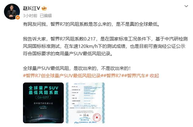 智界R7风阻系数全球量产SUV最低? 列出几款SUV的风阻系数做下对比: 智界R7:0.217 理想i8:0.218 乐道L60:0.229 特斯拉Model Y:0.230 蔚来EC7:0.230 小米YU7:0.245 小鹏G6:0.248 问界M7:0.249 需要注意的是,特斯拉Model Y L官方宣传风阻系数为0.216,这个仅是企业测试数据,并不是像智界R7那样在国家标准工况条件下,基于中汽研检测风洞国标标准测试出的成绩。 智界高管赵长江表示“全球量产SUV最低风阻,是吹出来的,不是吹出来的!”【来自懂车帝车友圈】