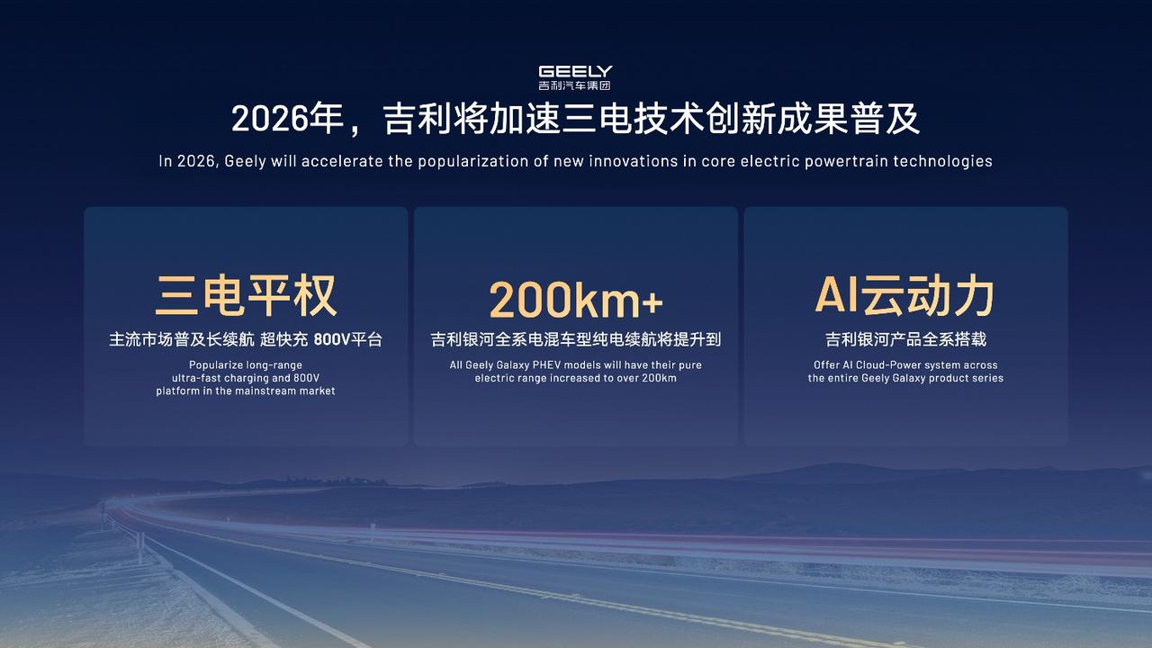 吉利宣布,今年上半年将发布全新的i-HEV智能双擎混动技术,百公里油耗最低只要3升,目标是要超过以省油著称的日系混动。基于这项技术,今年就会推出4到5款新车。同时,他们的全固态电池今年也会装车测试,并计划在法规允许后,推送更高级的自动驾驶功能,甚至试点无人出租车。2026年吉利将迎来“产品大年”,几乎每季度都有全新车型上市,并向着年销345万辆的目标发起冲击。吉利混动技术