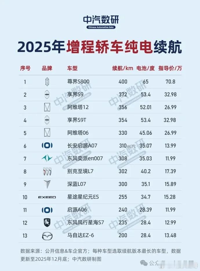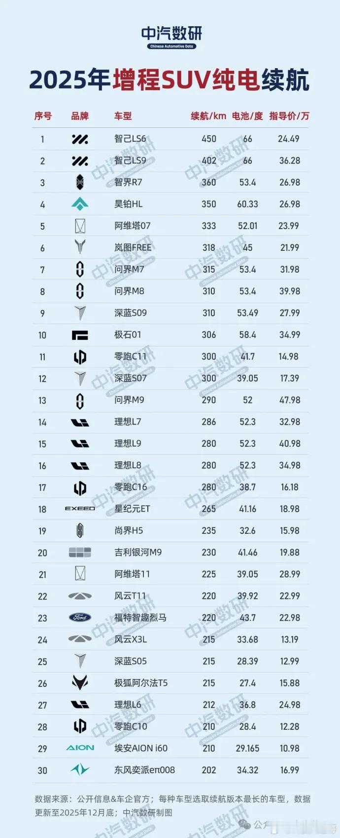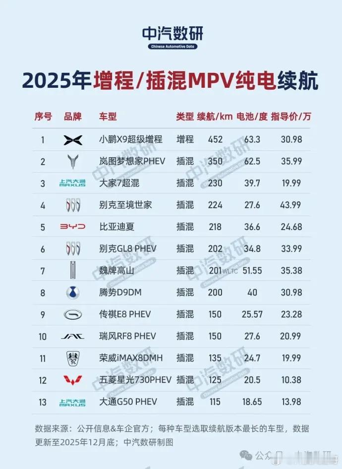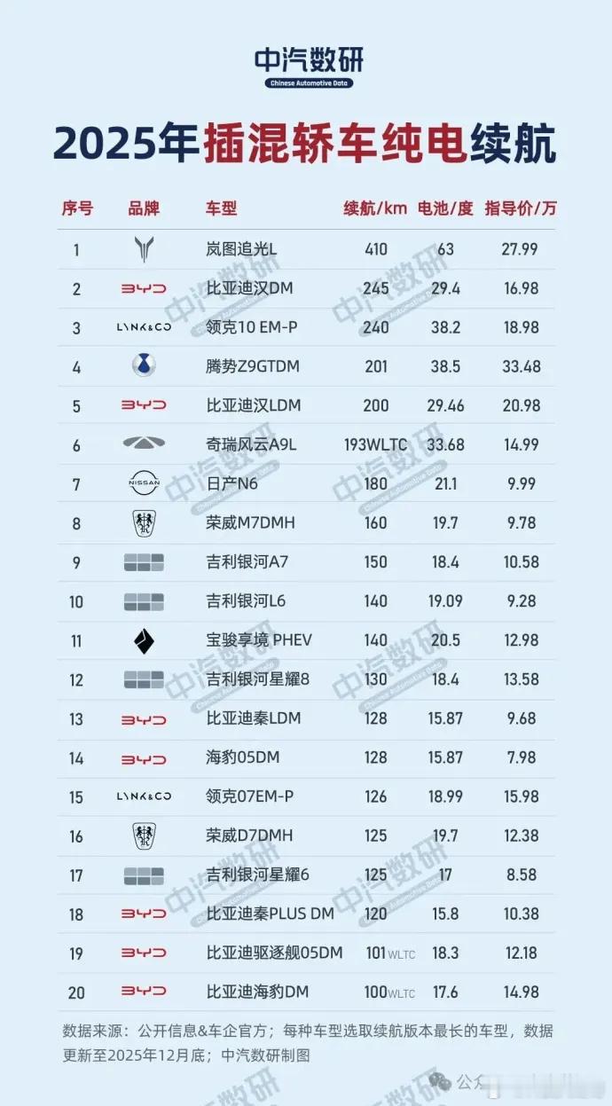 科技犬总结 兄弟们,2025年这混动车市场是真疯了啊!我刚扒完中汽数研的这几张榜,好家伙,这哪是技术竞赛,这分明是“军备竞赛”加“价格血战”,把桌子都掀了!咱不整那些虚的,直接捞干的唠。一、SUV战场:续航没最高,只有更高,价格没最低,只有更卷!先看插混SUV,极氪9X 直接整了个380公里纯电续航,配70度大电池,卖50万。意思很明确:我虽然是插混,但纯电续航能干翻一堆中档纯电车,有钱就上顶配,体验拉满。后面跟着的岚图、领克、魏牌,个个都是250公里以上的续航,放在两年前这都是主流纯电的水平了。但更吓人的是增程SUV!智己LS6 以450公里纯电续航霸榜,直接把标杆捅破了天。智己LS9、智界R7紧随其后,都干到350公里以上。这说明啥?增程路线被玩出花了,大电池+高效增程器,市区通勤当纯电,长途无焦虑,这“BUG”组合越来越香。问界、理想这些老玩家虽然排名不靠最前,但280-315公里的续航也完全够打,市场已经被教育得很成熟了。价格方面,那叫一个冰火两重天。比亚迪 还是那个“价格屠夫”,宋Pro DM 133公里续航版敢卖10.28万,直接把插混SUV门槛焊死在10万级别。另一边,零跑C10、东风风神L7 这些,用200公里左右的增程续航,杀进12万区间,这性价比,让同价位的燃油SUV和纯电小车怎么活?但高端市场也坚挺,理想L9、问界M9照样40多万往上走,人家卖的是全家桶体验。二、轿车战场:续航“以下犯上”,轿车要革SUV的命?轿车这边更夸张!岚图追光L 一个插混轿车,纯电续航干到410公里,电池63度,这数据让很多SUV都脸红。比亚迪汉家族、领克10 EM-P这些也都是200公里续航以上的狠角色。增程轿车更是“神仙打架”。尊界S800 续航400公里卖70多万,这定位是冲着豪华品牌去的。但更主流的是 享界S9、阿维塔12 这些,350公里+续航卖25-33万,科技感和续航全都要。最狠的是 东风奕派eπ007,308公里续航敢报价11.99万,深蓝L07 300公里续航卖15万多,这简直就是用B级车的价格,提供媲美甚至超过很多纯电车的市区通勤体验,还要啥自行车?三、MPV战场:新势力“偷家”,传统豪强压力山大MPV市场最有意思。榜首是谁?小鹏X9超级增程!一个以前专注纯电的新势力,用452公里超长增程续航和30.98万的价格杀进来,这分明是来“偷家”的。传统MPV强者岚图梦想家 用350公里插混续航紧跟,比亚迪夏、腾势D9、别克GL8 PHEV等也都在200公里续航区间站稳。这个市场过去是燃油车的堡垒,现在被混动(特别是增程)硬生生撕开口子,空间大、能耗低、无里程焦虑,成了家庭和商务用户的新宠。四、建哥锐评:2025,混动市场三大真相“续航攀比”白热化:以前混动谈续航过百就合格,现在不过200公里都不好意思打招呼。电池越做越大,但价格并没等比上涨,技术进步和成本控制确实牛。“两条腿”跑出不同姿势:插混(PHEV) 更像“全能战士”,发动机可直驱,高速能效有优势,结构相对复杂。增程(EREV) 则是“纯电体验派”,结构简单,纯电驾驶感受更纯粹,市区通勤占比高的用户会觉得真香。现在两者续航都上来了,选择就看你是更看重全场景能效,还是更追求极致的纯电体验。价格与市场彻底撕裂:10万出头能买混动SUV,70多万也能买混动轿车。市场彻底细分,从“性价比屠夫”到“豪华标杆”,每个价位段都有硬货。这对消费者是绝对利好,但对车企是生死考验——没核心技术和成本控制力,真的会被卷死。总结:2025年的混动市场,一句话:技术下放,价格探底,选择爆炸。 无论是追求极致续航、性价比,还是豪华体验,总有一款车能对上你的需求。燃油车的优势阵地正在被混动一个个攻克,这不是未来趋势,这就是正在发生的现实。兄弟们,攒好预算,明年车市,更有好戏看!2025混动内卷 续航为王 建哥说车