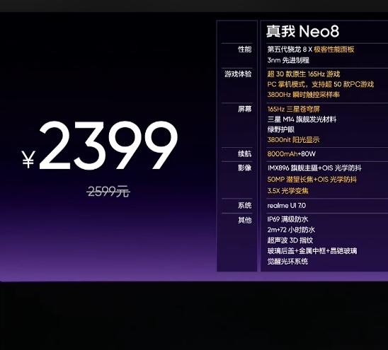 真我Neo8价格来了! 大家看看: 12GB+256GB 首发2399元;国补2039.15元 16GB+256GB 首发2699元;国补2294.15元 12GB+512GB 首发2899元;国补2464.15元 16GB+512GB 首发3199元;国补2719.15元 16GB+1TB 首发3699元;国补3199元 4月开始,真我加入OPPO售后渠道