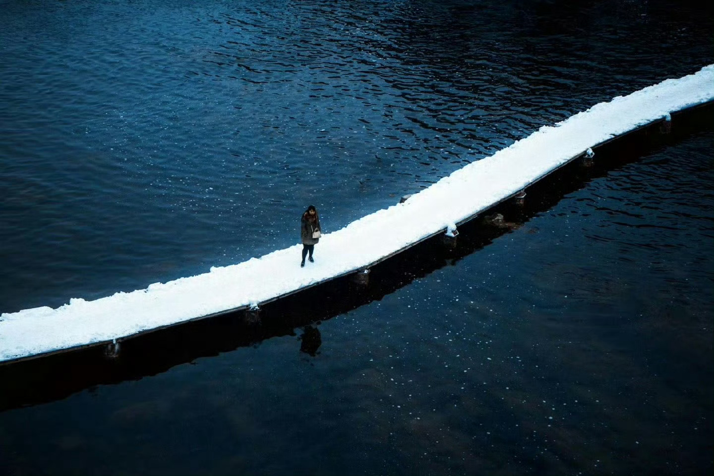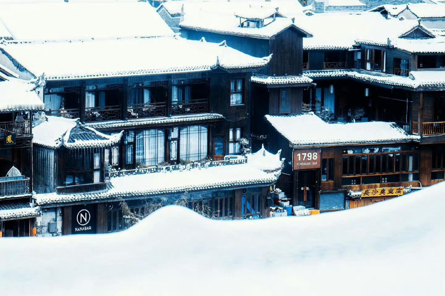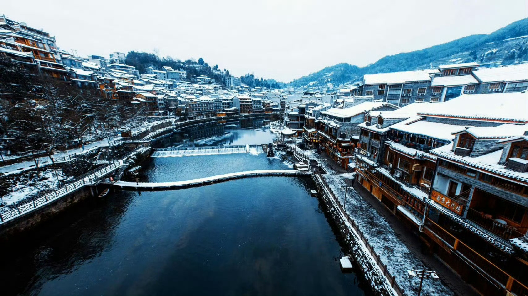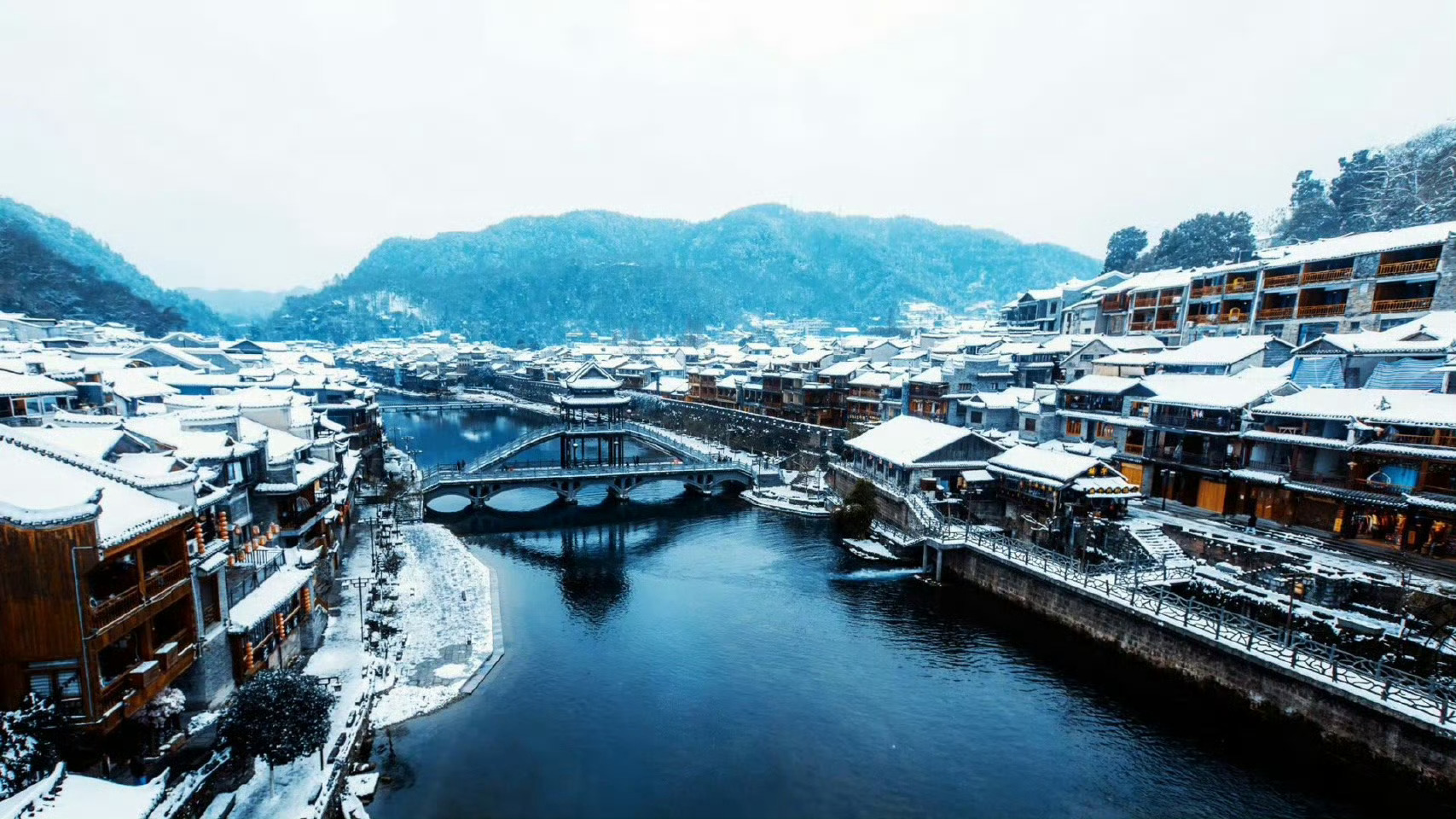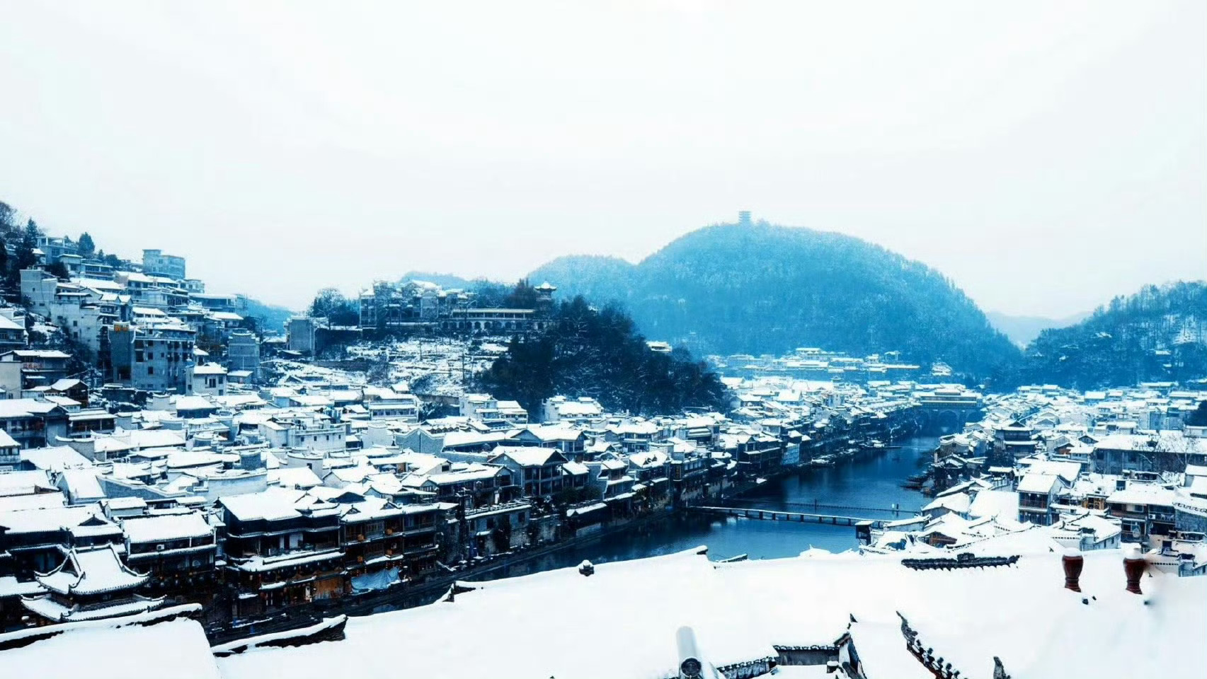 飘雪过后的凤凰古城,静静的,素素的,有如换了银装的冬姑娘。依然的沱江水,把这份素色分为两半,一半在这头,一半在那头。