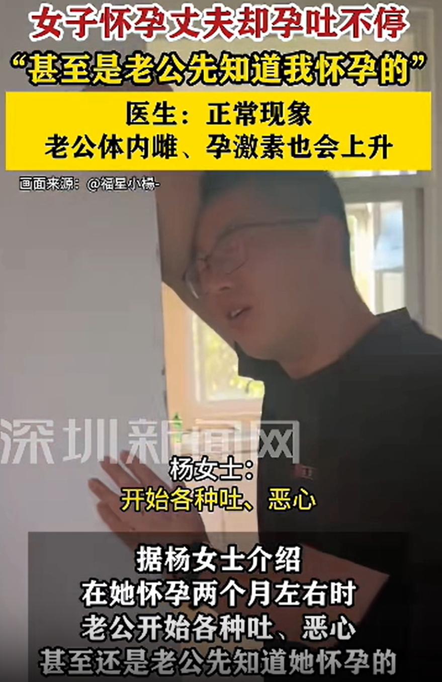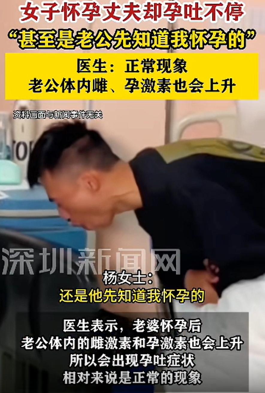 这下解释不轻了!山西,一女子怀孕后,自己倒是没多大反应,反倒是她老公开始每天恶心呕吐,吃不下东西,严重的时候甚至闻见油烟味都想吐。女士头一回怀孕,心里没底,赶紧拉着老公去医院检查,心里还琢磨着是不是丈夫身体出了啥问题,医生却挺淡定:这是正常的 医生听完描述后告知,说这情况虽然不普遍,但也正常。原来妻子怀孕之后,丈夫体内的激素也可能发生变化,尤其是雌激素和孕激素水平会上升,身体敏感的人就会出现类似孕吐的反应,医学上也有相关的观察记录 杨女士表示,在她怀孕两个月左右时,老公开始各种吐、恶心,甚至还是老公先知道她怀孕的 有网友说:常见吗? 我怎么第一次听说 男的孕吐的 这个情况听起来确实很新鲜,毕竟我们都知道孕妇因为体内激素波动,常常会经历恶心、呕吐,但从来没听说过老公也会有同样的症状。其实,这种“男版孕吐”现象有个名字叫做“同感症”,就是丈夫也会在妻子怀孕时,感受到相似的生理反应。虽然这种情况不常见,但也并不是特别罕见 简单说,夫妻的情感和生理状态密切相连,这种“共感”虽然不普遍,但也说明夫妻之间有很强的情感纽带 以前总觉得“孕吐”是孕妇的专利,现在看来,身边人真在乎你的时候,身体是会有信号的。生活的经验往往比我们想象的更具体,也更鲜活
