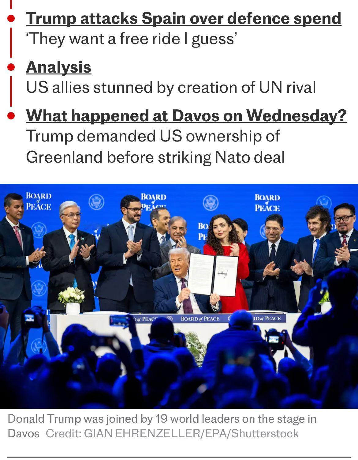 特朗普真要和联合国对抗?特朗普在瑞士与19个国家领导人签署了“和平委员会宪章”,其中包括来自蒙古、乌兹别克斯坦、哈萨克斯坦、科索沃、巴拉圭、印度尼西亚、阿塞拜疆和匈牙利的领导人或代表。此前,特朗普已经给60多个国家的领导人发出邀请。目前,明确表示不参与的国家有英国、法国、德国、意大利等欧洲大国。