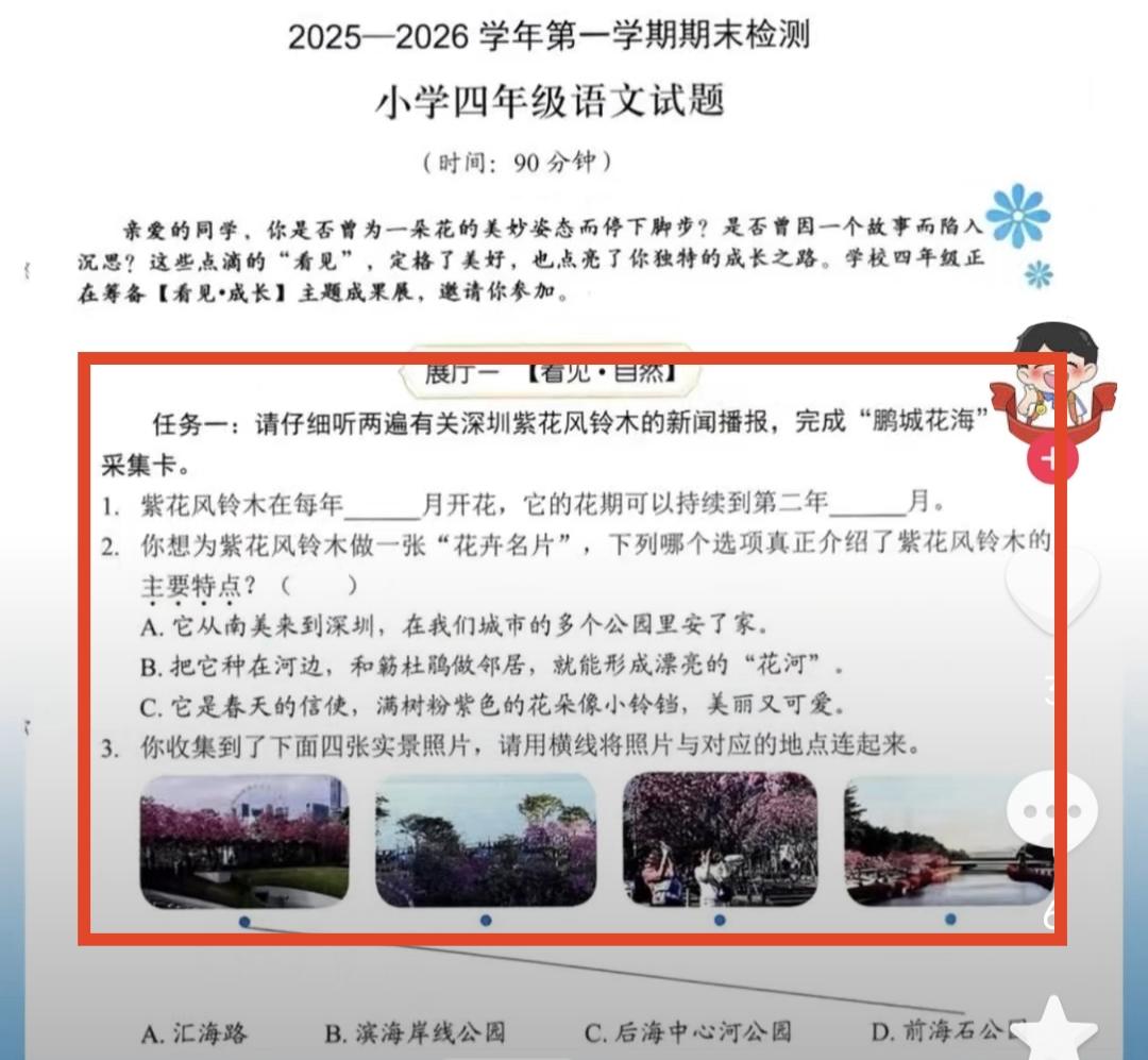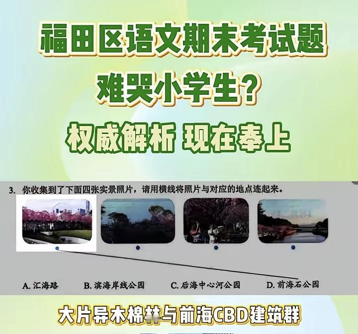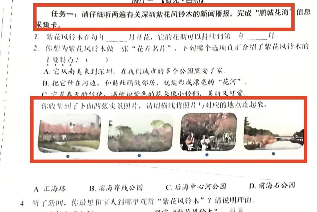 深圳市福田区四年级语文考试网红题,很抱歉我要更正一下并收回刚才的微头条。网上流传的版本是图一当中单独截取下来的,其实这一问福田学生考南山公园并不是独立的,而是一道听力题的一部分,学生根据听力材料当中的文字信息,就可以选出正确答案。所以它考的依旧是文字信息的提取能力,有没有去逛公园学生都可以选出正确答案。如果这是一道独立题目的话,那确实存在很大问题,福田区有很多高颜值的公园,比如莲花山公园,红树林公园中心公园等等,都可以形成一道题目。但是如果要说红花风铃或者紫花风铃的话,南山区确实风景更壮观一些,尤其是人才公园后海那一带。所以整体来说这道题是没有什么问题的,当然,周末带孩子多逛逛公园,多逛逛自己生活这座城市,除了积累知识也了解这座城市,这次有百益而无一害的。
