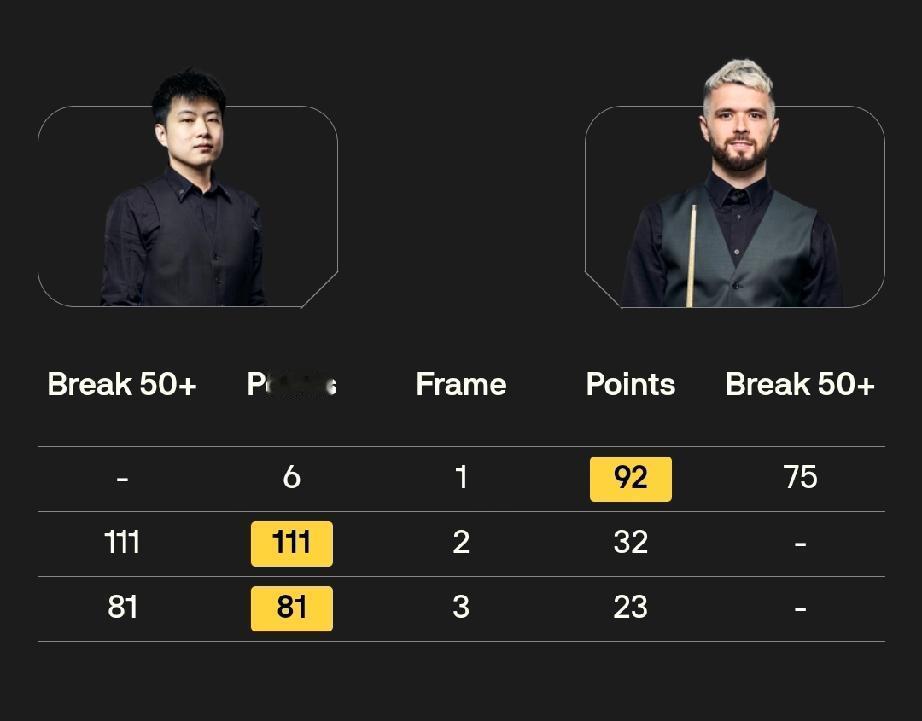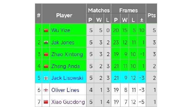 赵心童 2-1 莱恩斯 1月22日,冠军联赛第六小组赵心童最后一个对手,对阵莱恩斯。 胜负与否不影响赵心童小组出线。