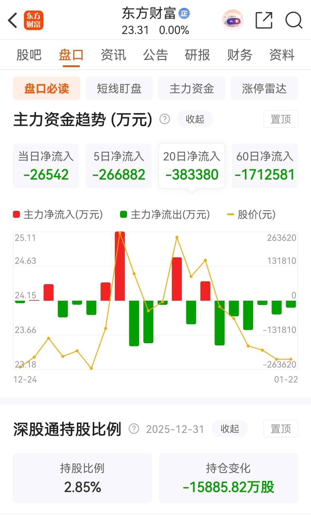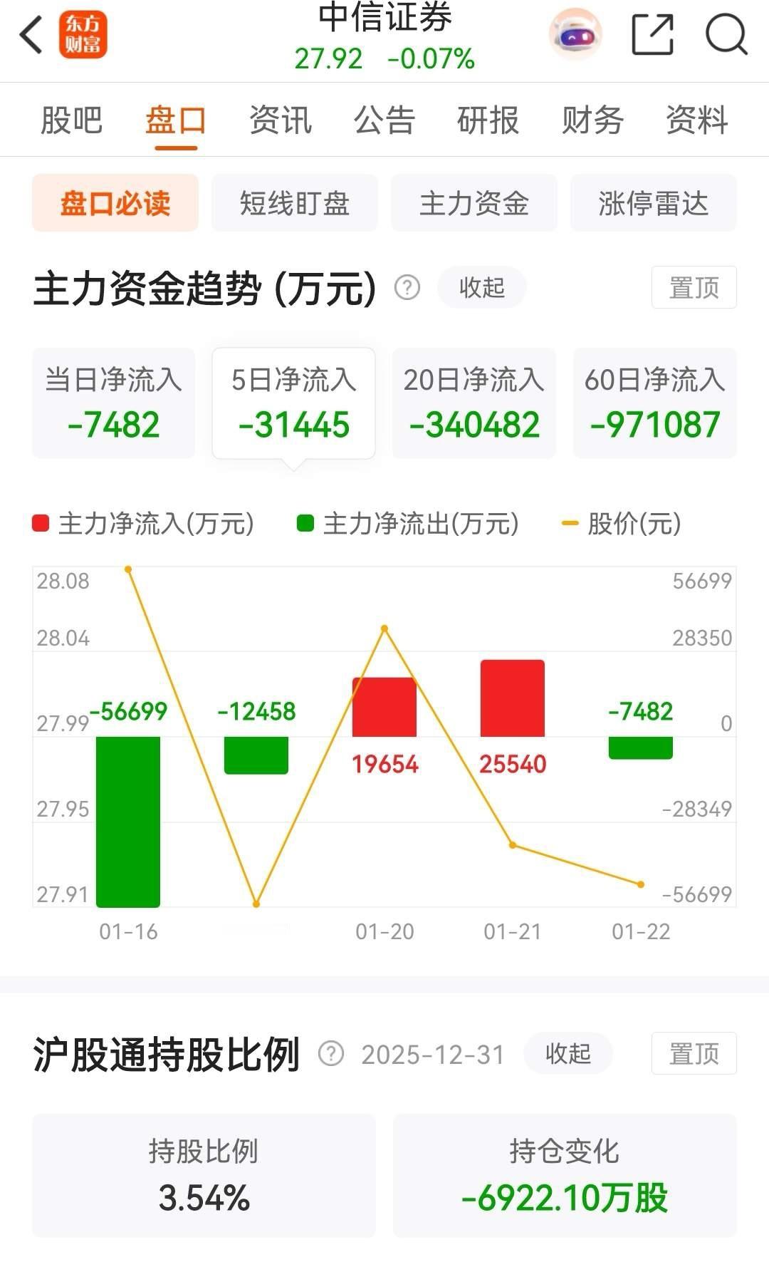 东方财富和中信证券冲高回落后在低位横盘整理,其中东财被主力资金连续六天净卖出。东方财富今天平开后冲高回落,最终平盘报收,目前的报价为23.31元。在资金流向上,连续六天被主力资金净卖出,今天的净卖出金额为2.6542亿元,近五个交易日被主力资金累计净卖出了 26.6882亿元,近20个交易日则是被主力资金合计净卖出了约38.338亿元。从走势上看,目前已经连续调整了八个交易日了,整体走势呈现出破位的态势,在2026年的上涨幅度已经缩水为0.56%了。中信证券今天低开后冲高回落,随之一直在水下震荡整理,收盘时股价下跌了0.07%,报价为27.92元。而在资金流向上,今天被主力资金净卖出了0.7482亿元,近五个交易日则是被主力资金合计净卖出了3.1445亿元。从当前的走势上看,自从新年的前两个交易日上涨以来一直都在调整,目前则是在底部年线处横盘整理了四个交易日。至于更详细的技术分析,可以查看上一篇中关于券商概念板块今天的走势分析。对于东财和中信证券来说,目前二者面临的共性风险有,政策调控导致的业绩与股价背离短期内或持续,需警惕流动性变化冲击。而对于东方财富,若市场缩量或减持压力加剧,高估值可能引发抛压。中信证券,目前越秀资本减持1%股份(约40亿元)及信用风险上升,短期承压明显。