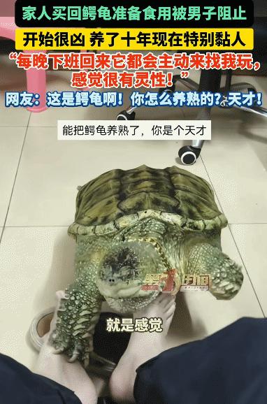 “太有灵性了!”广东佛山,男子的家人买回鳄龟准备食用,被他阻止。没想到,他决定养着,开始很凶,养了10年,现在特别黏人。网友: 这是鳄龟,你怎么养熟的? 近期广东佛山,一则男子养鳄龟的视频刷爆全网,看得无数网友直呼神奇,甚至忍不住发问“这是鳄龟?你怎么养熟的”。原本一只被家人买回准备下锅食用的鳄龟,被男子果断阻止救下, 他一时兴起决定自己养着,起初这只鳄龟凶神恶煞、极具攻击性,可谁能想到,十年朝夕相处下来,这只本该生性凶猛的鳄龟,竟然变得格外黏人,反差之大让人惊叹不已。 十年前广东佛山的一名男子,像往常一样下班回家,一进门就闻到了淡淡的腥味,走近厨房才发现,家人买回来一只体型不算小的鳄龟,正放在盆里,旁边还摆着处理食材的工具,显然是准备把这只鳄龟当成食材,做一顿美味佳肴。 男子一眼就看中了这只鳄龟,看着它在盆里不安地扭动,眼神里满是警惕和凶狠,心里瞬间软了下来,也生出了一丝不忍。 他没有丝毫犹豫,立刻阻止了家人的举动,直言自己不想让这只鳄龟被吃掉,决定把它留下来,当成宠物养着,家人见他态度坚决,也没有过多反对,只好同意了他的想法。 刚开始养鳄龟的时候,男子可是吃了不少苦头。这只鳄龟性子极其凶猛,极具攻击性,只要男子靠近它的笼子,它就会猛地扑上来,发出凶狠的嘶吼声,眼神里满是敌意, 甚至会用锋利的爪子抓挠笼子,丝毫没有要妥协的意思,就连男子给它喂食、换水,都要格外小心,生怕被它咬伤、抓伤。 男子没有因为鳄龟的凶猛而放弃,反而格外有耐心,每天都会按时给它喂食,小心翼翼地给它换水、清理居住的笼子,哪怕每次靠近都会被它凶狠对待,也从来没有抱怨过。 他会慢慢蹲在笼子旁边,安静地看着鳄龟,不主动打扰它,一点点拉近和它之间的距离,试图让它放下警惕,接纳自己。 日子一天天过去,鳄龟的态度也渐渐有了转变。它不再像一开始那样,一见到男子就凶狠扑击、嘶吼,偶尔会安静地看着男子,甚至在男子给它喂食的时候,会小心翼翼地靠近,不再随意攻击。 虽然依旧带着一丝警惕,但比起刚开始的凶神恶煞,已经温顺了太多,男子看在眼里,喜在心里,也更加用心地照料它。 这一养,就是整整十年。十年间,男子始终悉心照料着这只鳄龟,见证了它从小小的一只,长到体型庞大,也见证了它从凶狠警惕,变得温顺黏人。如今的这只鳄龟,早已没了当年的戾气,反而变得格外依赖男子,成了十足的“黏人精”。 男子每天下班回家,一进门就能看到鳄龟趴在笼子边上,安安静静地等着他,眼神里满是期待,再也没有了当年的凶狠。 只要男子打开笼子,它就会慢悠悠地爬出来,一步步蹭到男子的脚边,用脑袋轻轻蹭男子的裤腿,显得格外亲昵,甚至会乖乖趴在男子身边,任由男子抚摸它的背,温顺得不像话。 平时男子坐在沙发上休息,鳄龟就会悄悄爬过来,趴在男子的脚边,一动不动地陪着他;男子做家务的时候,它也会慢悠悠地跟在身后,时不时蹭一蹭男子的脚踝,仿佛在撒娇卖萌。 这样黏人的模样,很难让人联想到,它曾经是一只凶神恶煞、极具攻击性的鳄龟,更让人不敢相信,这竟然是人们印象中生性凶猛、难以驯服的鳄龟。 大多数网友看完视频后,都被这只鳄龟的转变惊艳到了,纷纷留言发问,满是疑惑和不解,直言“这是鳄龟?你怎么养熟的”,毕竟在大家的印象中,鳄龟生性凶猛、野性难驯,很难和人建立亲密的关系,更别说变得如此黏人。 男子表示,自己也没有什么特殊的方法,只是十年如一日地悉心照料它,真心对待它,慢慢陪伴它,久而久之,鳄龟就放下了警惕,接纳了自己,甚至变得格外依赖自己。 他坦言,刚开始也没想到,这只凶神恶煞的鳄龟,竟然能变得这么黏人,这十年的陪伴,不仅改变了鳄龟,也给自己的生活,增添了很多乐趣。 对此,你们有什么看法,欢迎评论留言~