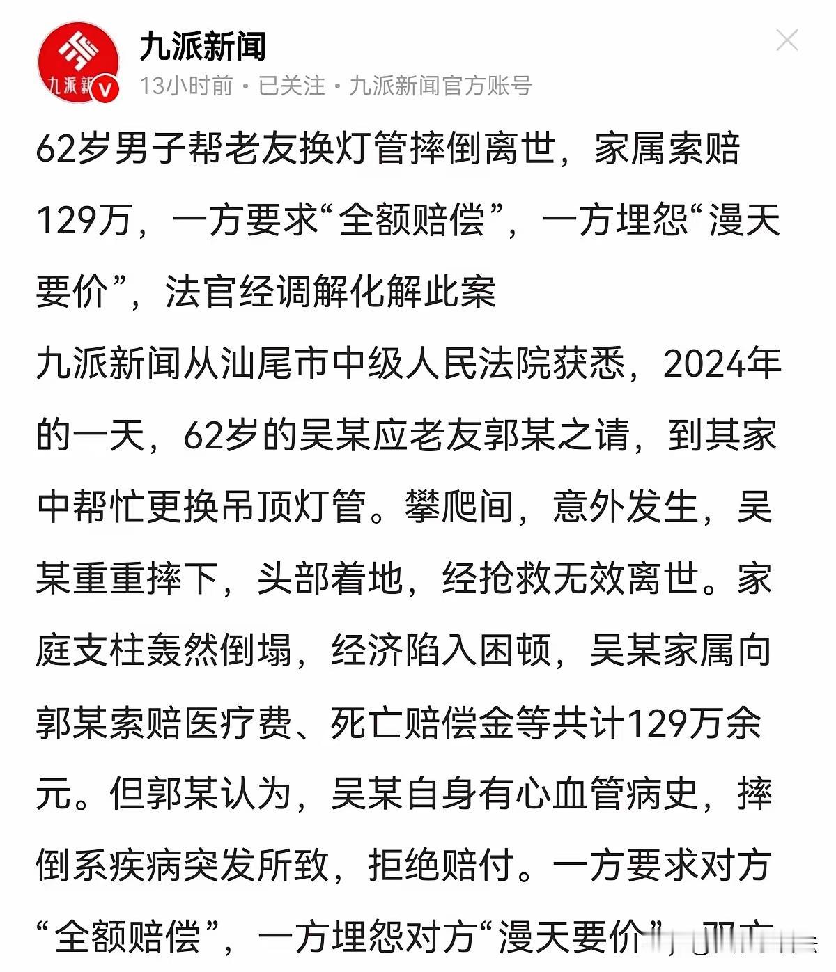 这起事件引发了广泛的社会关注,涉及法律责任、道德责任以及个人安全等多个层面。以下是对事件的分析和思考: 一、事件回顾与争议焦点 事件经过:66岁的吴某应好友郭某邀请帮忙更换吊灯灯管,结果在操作过程中意外摔下身亡。因吴某有心血管疾病,家属索要129万多元赔偿,而郭某坚持疾病是意外原因,双方矛盾激化,最终走上法庭。 主要争议: 死亡原因:是意外还是疾病发作致伤? 法律责任:郭某是否应承担赔偿? 遗体火化:缺乏直接证据,增加案件难度。 赔偿金额:129万元是否合理?是否为“漫天要价”? 二、法律角度分析 根据《最高人民法院关于审理人身损害赔偿案件适用法律若干问题的解释》,涉及无偿帮工的责任认定较为复杂: 无偿帮工,应以“过错责任”为原则。 被帮工人在帮工过程中受损,帮工人可能承担一定责任。 但若有明确疾病史且事故由疾病引发,责任范围会有所限制。 在本案中,由于吴某属无偿帮工,且火化后无法获取尸检、病历,证据不足,法院倾向于权衡双方表现,避免一味追责。 三、社会与伦理思考 求人帮忙的安全责任 朋友帮忙虽属善意,但未注意安全措施,可能需担负一定责任。 事发前,郭某曾叮嘱“慢点来”,但事发瞬间缺乏防护,应反思如何在帮工时保障安全。 赔偿责任与人情 家属对吴某产生强烈情感和赔偿诉求,反映家庭对亲人死亡的无法释怀。 法律应理性界定责任,避免情感冲动导致赔偿不公,维护社会公平。 “谁之过”与道德责任 吴某的死亡固然令人惋惜,但其健康状况与意外有关,责任难以单方面归咎郭某。 相互理解、合理赔偿应在法律规定和实际情况基础上达成。 四、网友评论与启示 “凡事自己解决不了就花钱解决,不要求人,花钱踏实!”这一观点体现了现代社会中“花钱买解决”的现实,但也提醒我们: 安全第一,凡事防范在先; 无论遇到多小的事,都应考虑潜在风险; 合理使用法律武器,不盲目诉讼,理性维权。 五、总结: 这起事故提醒我们,帮工虽出于善意,但安全责任不可忽视,特别是在老年人健康状况不明时更应谨慎。 法律责任应按事实认定,不能因家庭情感而偏袒一方,也不应一棒子打死所有责任。 社会应加强老年人安全教育和安全保障措施,减少此类悲剧发生。 解决争端应以协议或调解为优先,避免类似案件演变成激烈冲突。 **结语:**求人出事是否应赔,要综合考虑法律责任、事实证据、生命价值和社会伦理。理性面对问题,维护法律权威的同时,也应彰显人文关怀。你眼中的健康是什么样子的