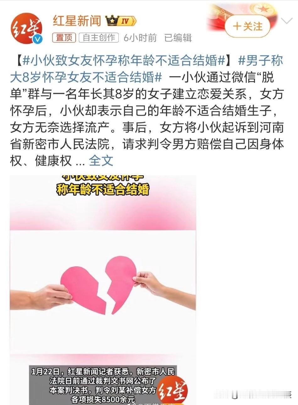 姐弟恋怀孕被拒婚,法院判决意外吗?30岁女子与22岁小伙网恋怀孕,男方一句“年龄不合适”拒绝结婚,女方无奈流产。法院最近判了:小伙补偿8500元! 这事提醒咱们,成年人谈恋爱,安全措施不是儿戏。男人一句“没准备好”,女人可能就得独自承受身心伤害。说到底,感情里责任心比心动更重要——没想清楚未来,就别急着摘禁果。 你觉得法院判8500元是多了还是少了?来聊聊你的看法!