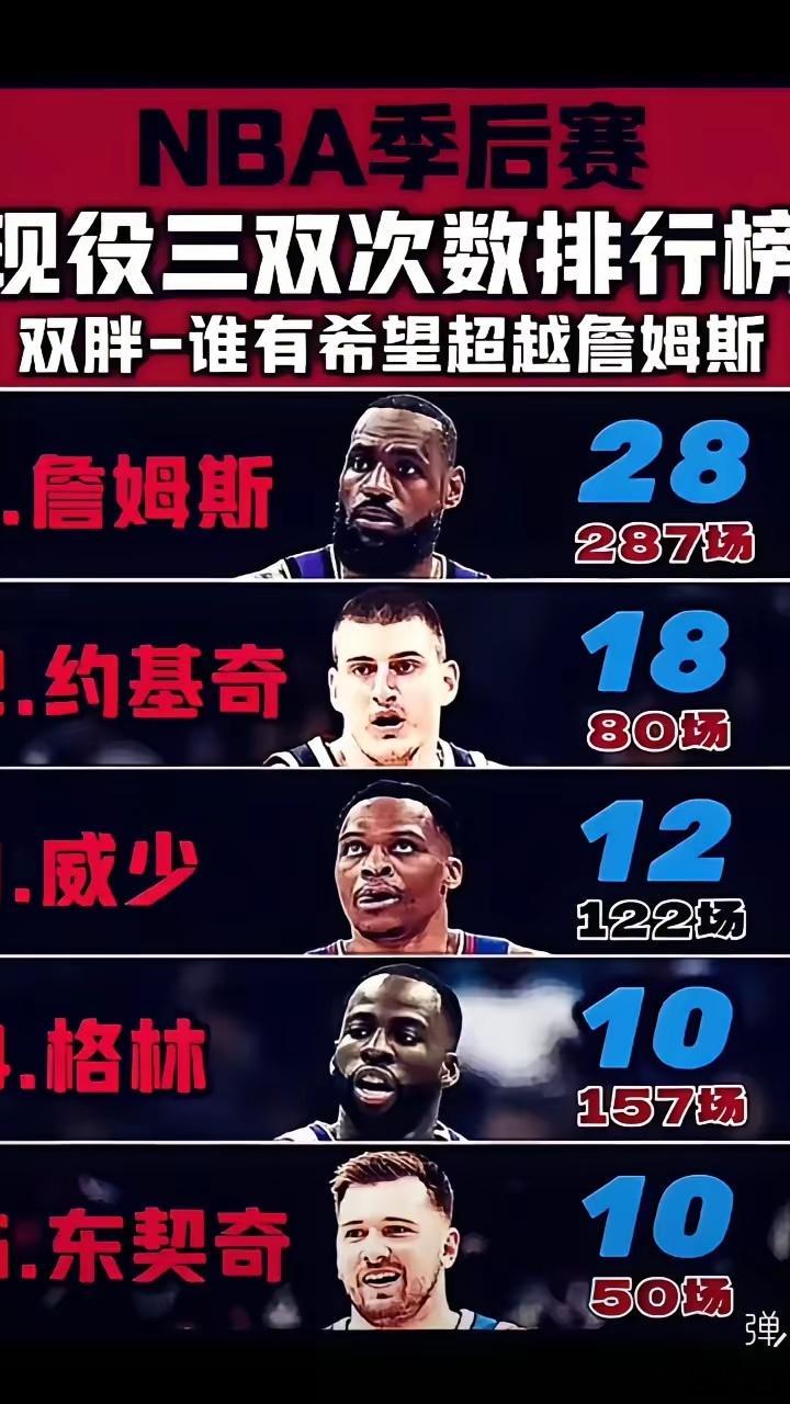 NBA季后赛现役三双数排行榜,谁有望超越老詹?