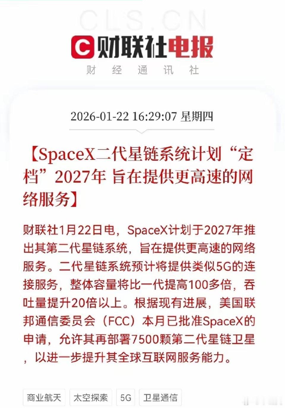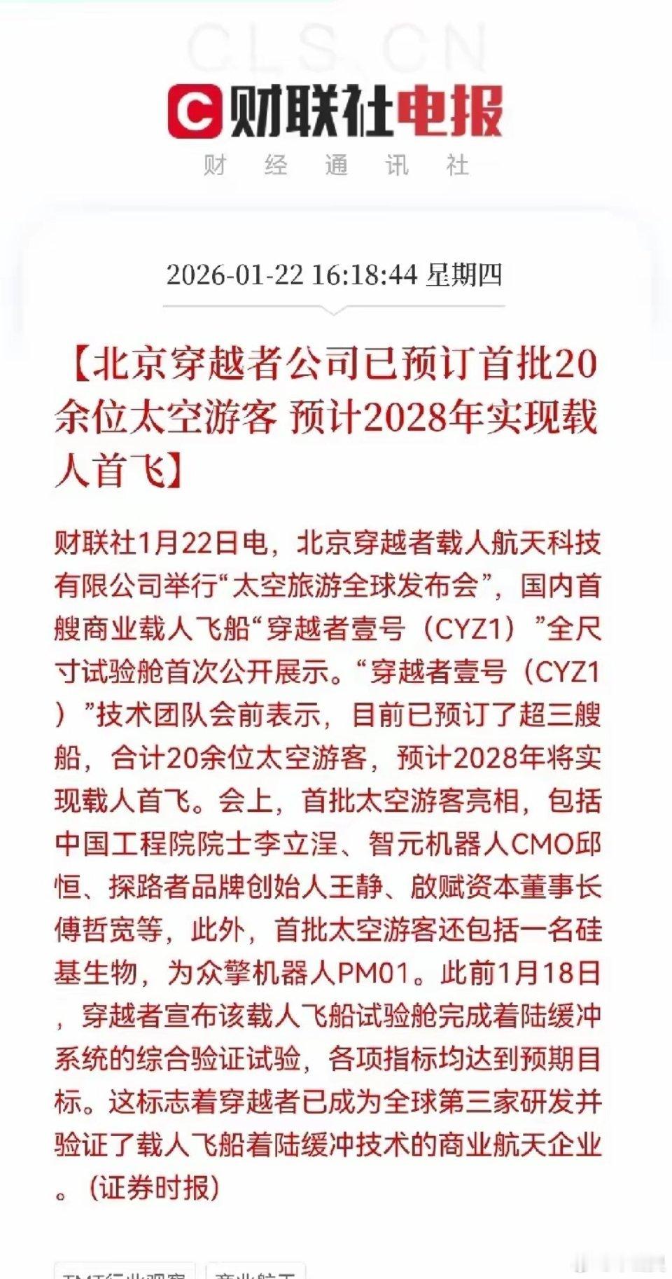 双大利好引爆商业航天!太空旅游落地+星链二代升级,赛道天花板再抬升盘后商业航天赛道迎重磅催化,国内太空旅游商业化落地+SpaceX二代星链定档2027,应用场景与技术维度双重突破,行业成长上限全面打开,资本市场风口已至!国产突破:太空旅游从概念到落地,商业载人航天迈入新纪元北京穿越者航天今日举办太空旅游全球发布会,不仅官宣国内商业载人航天技术实现核心突破,更已锁定超20名首批太空游客,300万元/张的亚轨道船票完成签约,2028年将实现载人首飞!作为国内唯一获批国家级商业载人航天项目的民企,穿越者已攻克载人返回“最后一公里”核心技术,成为全球第三家掌握该技术的商业航天主体,其自研的穿越者壹号飞船可重复使用率达99%,预计3-4年内就能让普通人体验3-5分钟太空失重感。这一突破标志着我国商业航天正式从技术研发迈入市场化应用阶段,太空旅游、亚轨道科研等场景落地加速,据预测2030年国内商业载人航天相关市场规模将达千亿级,上下游特种材料、航天制造、航天文旅等产业链将全面受益。全球升级:SpaceX二代星链定档2027,空天地一体化网络再提速全球商业航天巨头再放大招,SpaceX官宣2027年推出第二代星链系统,美国FCC已批准其再部署7500颗二代卫星的申请!相较于一代,二代星链整体容量提升100多倍、吞吐量超20倍,单星下行速率最高突破1Tbps,还将全面支持“手机直连”服务,覆盖超155个国家,跨洲通信延迟降低30-40ms,直接对标地面5G网络。星链二代的技术升级不仅推动全球卫星互联网进入高速时代,更将加速空天地一体化网络建设,为6G研发提供核心技术支撑,卫星通信、火箭发射、终端制造等细分领域迎来长期技术红利,而国内“双星座并行”策略下,卫星互联网国产化替代与技术追赶也将进入加速期。赛道共振:政策+技术+需求三重加持,资本市场迎主升浪商业航天作为新质生产力核心赛道,此次双大利好实现了消费端需求激活+技术端全球升级的双重共振,叠加国家层面政策持续加码、海南商业航天发射场常态化运行,行业正迎来5万亿级市场规模的黄金发展期。从今日盘面已能窥见资金态度,商业航天核心标的集体走强,中国卫通大涨8.09%、航天电子涨6.20%、中国卫星涨3.36%,龙头标的资金扎堆明显。盘后重磅利好落地,行业基本面再获强支撑,明日商业航天板块有望迎来跳空高开,卫星通信、商业载人航天、火箭制造等核心细分赛道,或将开启新一轮主升行情!