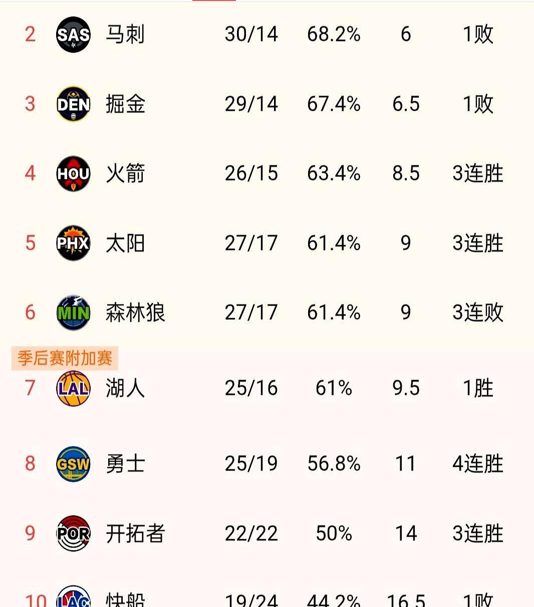西部第4了!火箭3连胜把快船甩出附加赛 今天打完,火箭111-106再赢马刺,落后16分翻回来。申京20+13+9,谢泼德末节12分,杜兰特18分,全队像赛季初那样跑轰,三连胜直接升到第四。 快船19胜24负,第十名,离火箭差5.5场,想追几乎没戏。勇士25胜20负排第八,刚输球,保六喊不出口。太阳27胜17反超森林狼,湖人26胜16排第五,掘金29胜15守第三。 西部前六直通,7-10打附加赛。火箭现在26胜15负,只要稳住打法,季后赛门票基本揣兜里。