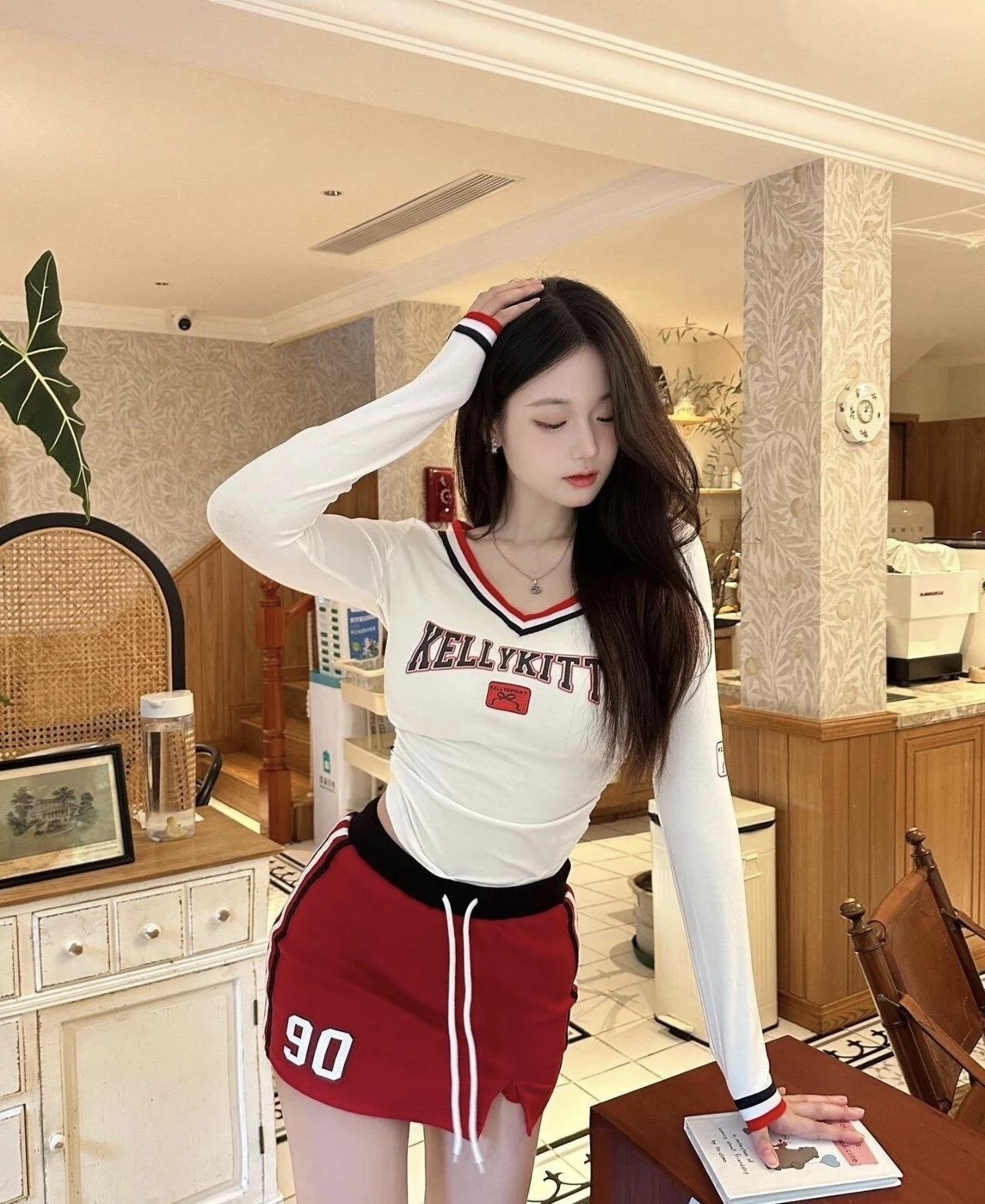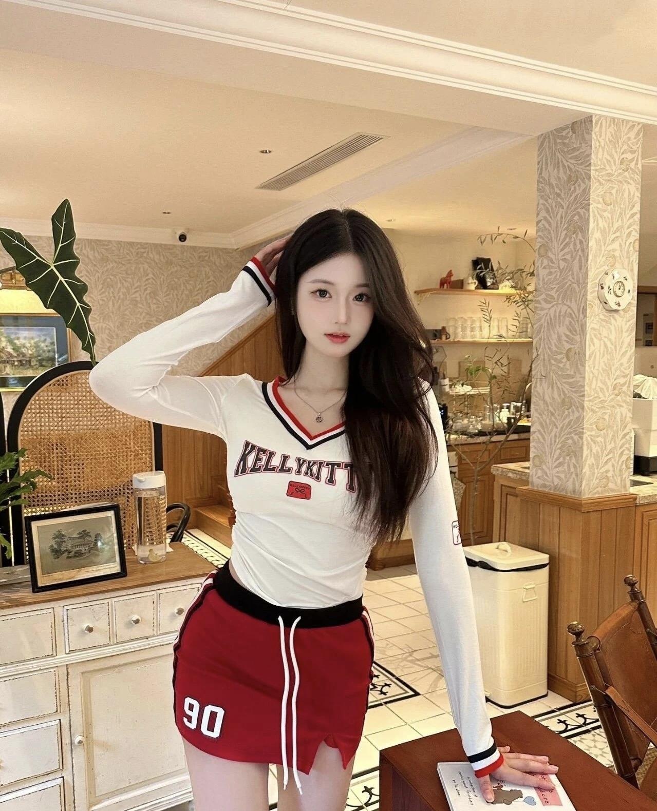 🩹 复古插肩袖短T配牛仔热裤,在红黑撞色的潮酷背景里,把美式辣妹的松弛感拉满。