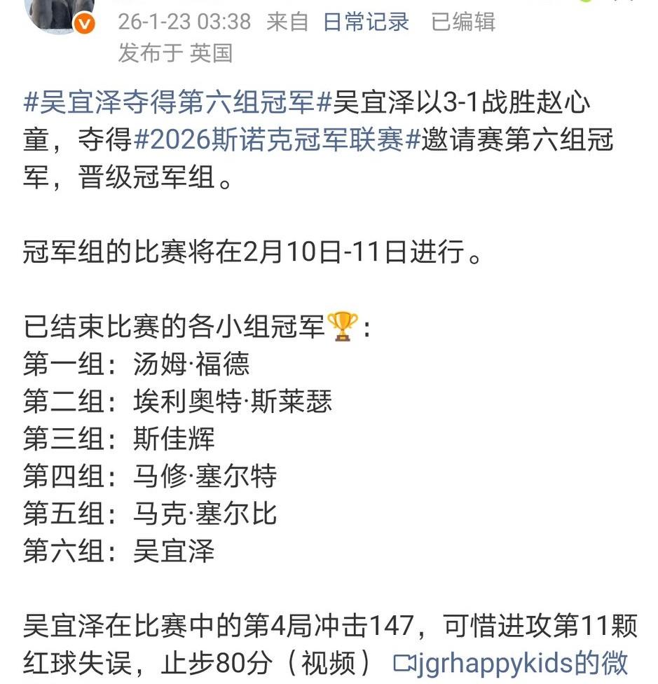 2026斯诺克冠军联赛第6小组,3名中国球员打出147,吴宜泽击败赵心童夺冠,赵心童再次饮恨。 小组前四:赵心童、吴宜泽、张安达、杰克琼斯。 半决赛: 赵心童3-0杰克琼斯 吴宜泽3-0张安达 决赛: 赵心童1-3吴宜泽