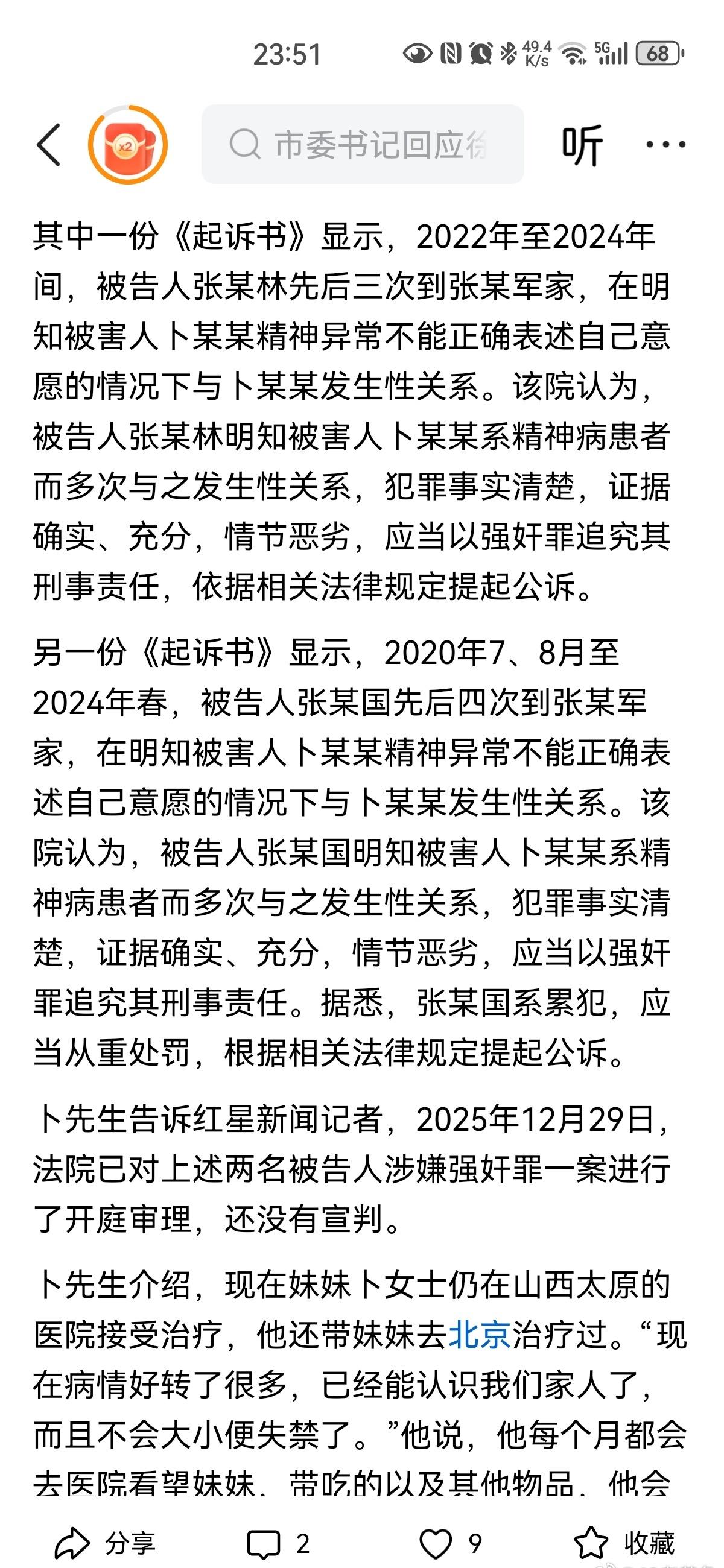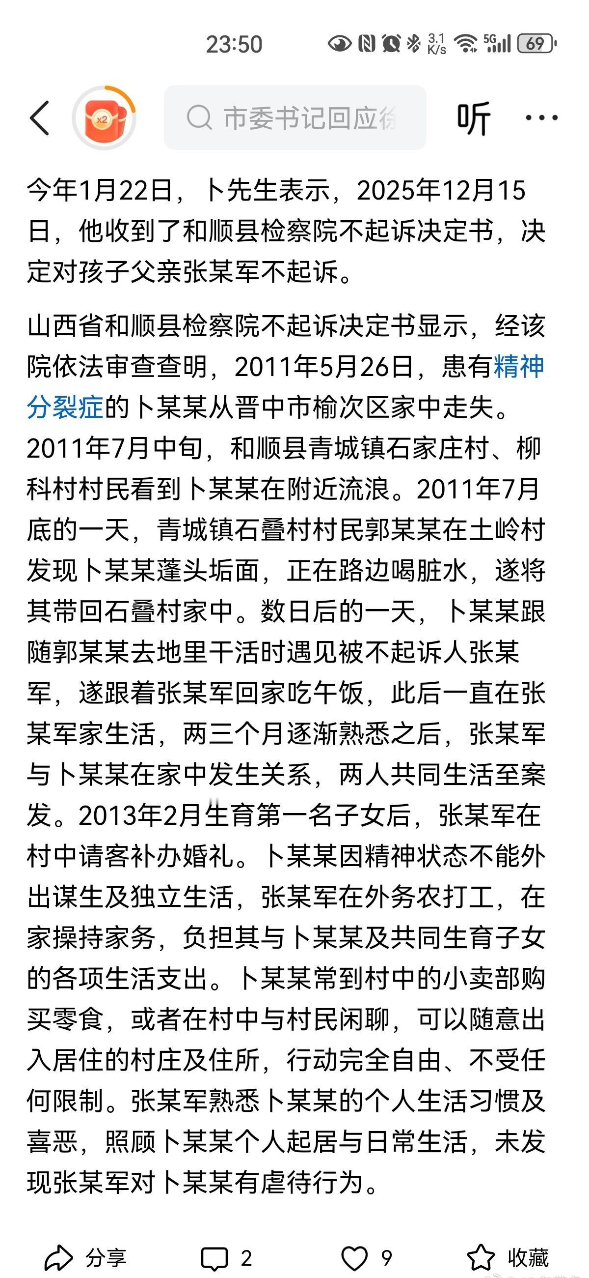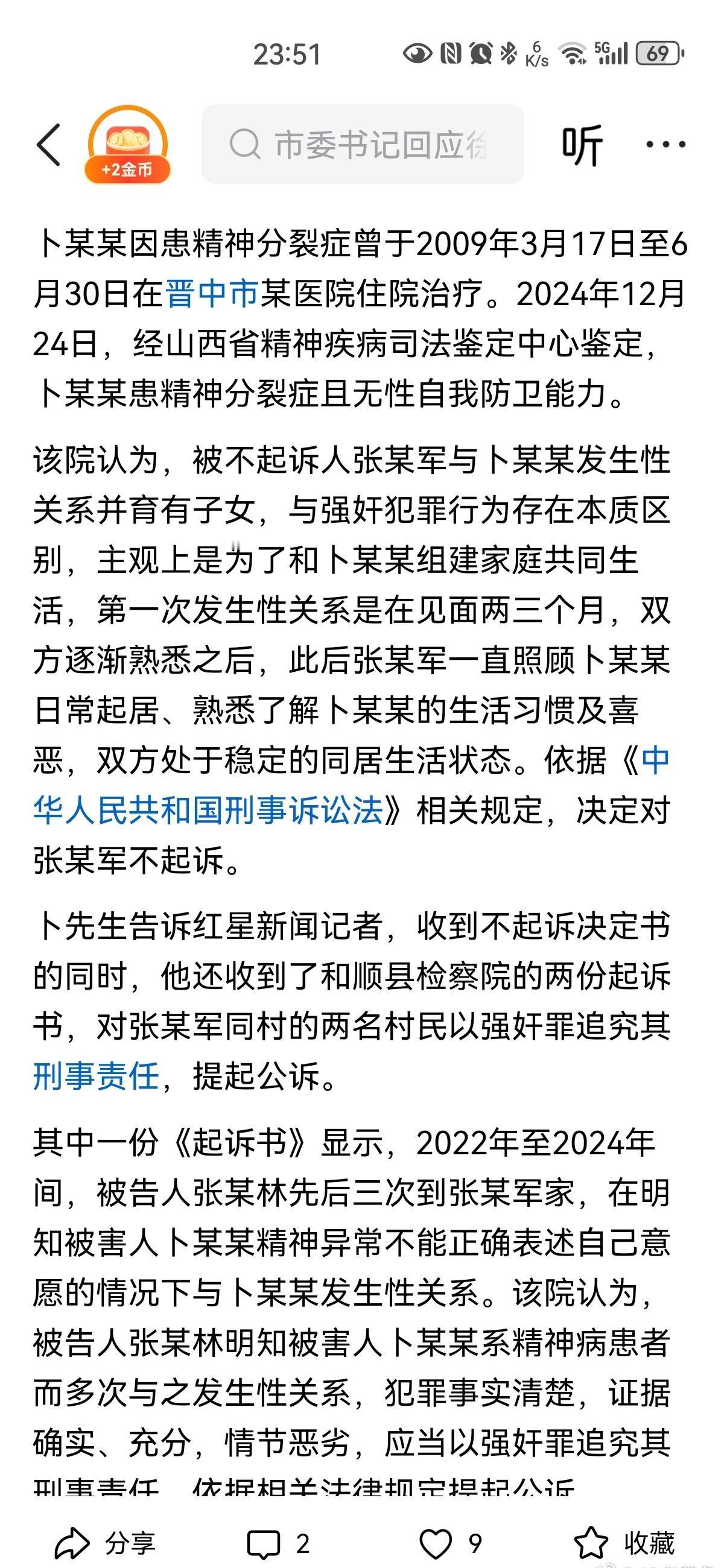该事件司法处理有结论了。与其共同生活且育有子女的“丈夫”,检察院决定不予起诉。同时,检察院以涉嫌强奸犯罪起诉两村民,案件正在法院审理中。