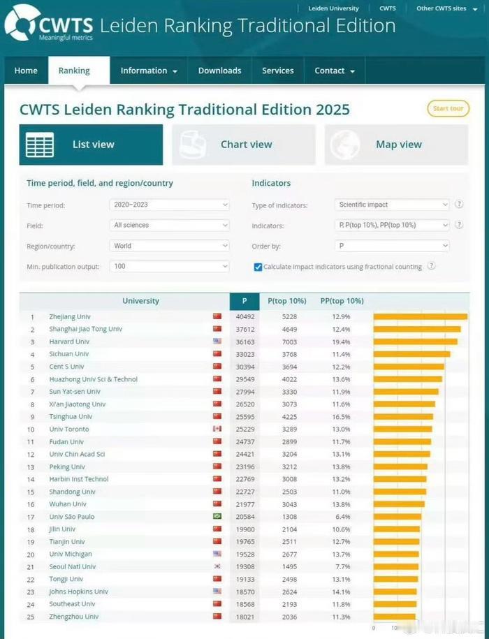 莱顿榜大颠覆!浙大登顶全球第一 中国8校霸榜前十清北未进前七 2026莱顿世界大学排名出炉,浙大登顶全球第一,改写全球高校科研格局!这份以论文产出、高被引比例为核心的纯科研排名中,中国高校霸榜,全球前十占8席,清华、北大未进前七,分列第9、14位。 榜单聚焦硬核科研数据,无主观打分,浙大凭量质双优的科研成果力压哈佛、斯坦福。上海交大、川大、中南大学等紧随浙大,前十仅哈佛、多伦多大学为非中国高校。 清北排名靠后并非实力下滑,而是受榜单评价逻辑限制,人文社科、基础学科优势难以体现。此次排名彰显中国高校科研实力集体崛起,是国内高等教育长期科研投入与学科布局的成果,也印证全球学术格局的东方转向已成趋势。