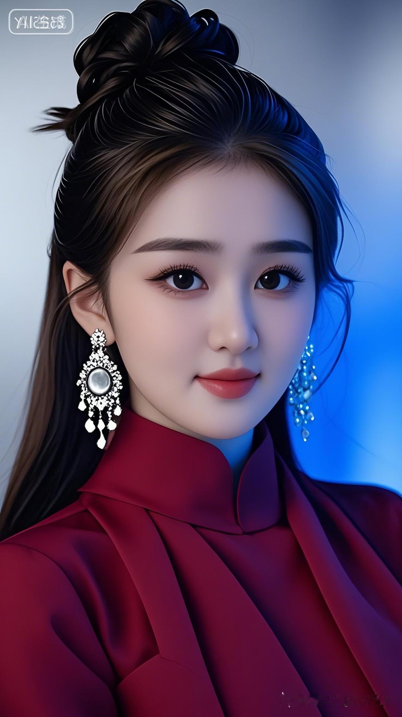中长发佳人着酒红色衣装,容颜秀丽完美,气质集高级、高贵与典雅于一身,身姿优雅曼妙,纯澈蓝色背景衬得人物愈发精致出众。