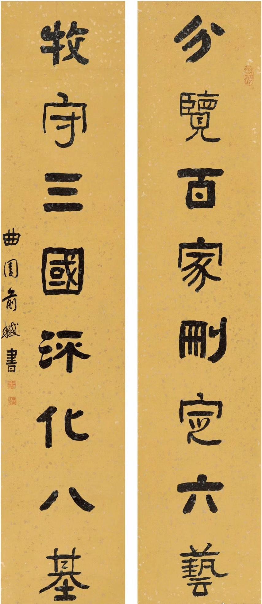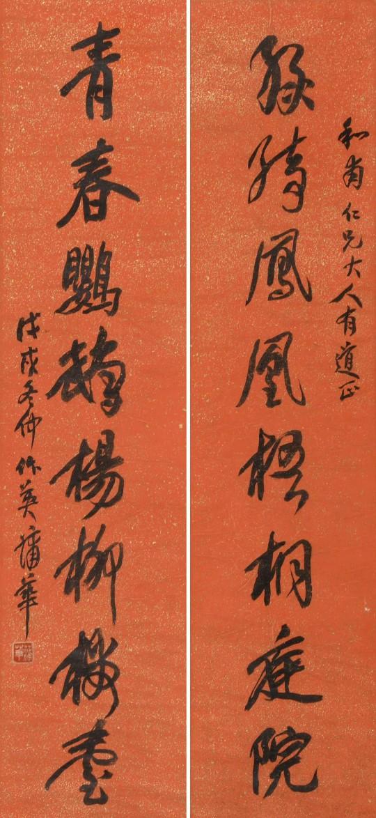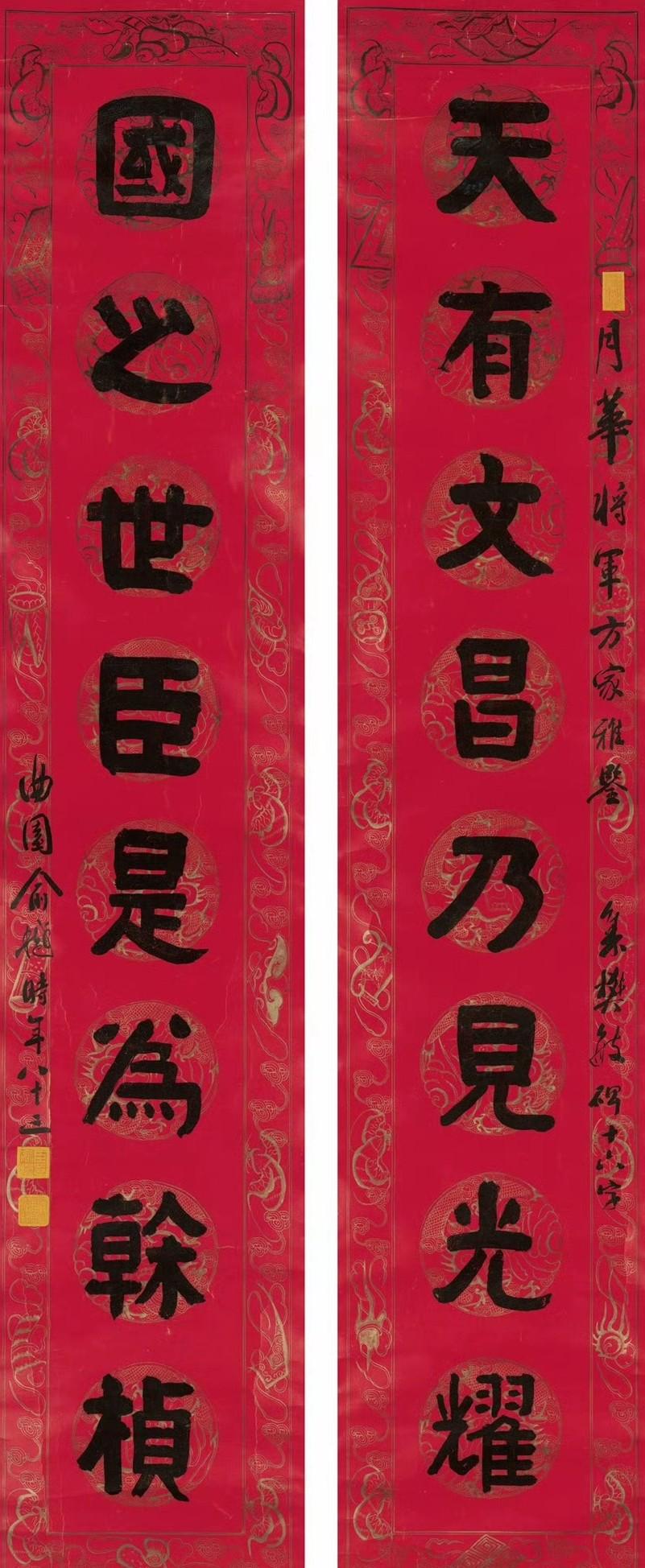 张祥河 行书 八言联 ​​​ 《尽得风流赏雨茆屋,若其天放濯足扶桑》 俞 樾 隶书 八言联 ​​​ 《分览百家删定六艺,牧守三国流化八基》 于右任 行书 八言联 《郎日和风得天之乐,崇山曲水随地可娱》 张廷济 隶书 八言联 翁同龢 楷书 八言联 《配曜岳嵩为国桢幹,比踨豹产膺姿管苏》 蒲华 行书 八言联 ​​​ 《绿绮凤凰梧桐庭院,青春鹦鹉杨柳楼台》 何绍基 隶书 八言联 ​​​ 《良辰美景赏心乐事,英词妙墨好古多闻》 俞 樾 隶书 八言联 ​​​ 《天有文昌乃见光耀,国之世臣是为干桢》 谭延闿 行书 八言联 《缛旨星稠繁文绮合,秀藻云布潜思渊渟》