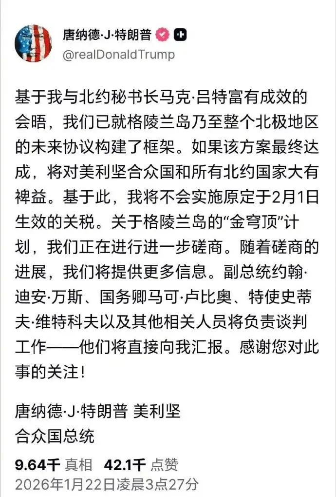 特朗普,两天两个态度 21日,还在吐槽欧洲,说美国几十年对欧洲的帮助,要块冰冷的土地不过分。 22日,改为有待商榷。 因为欧洲进行了反制,冻结了去年达成的美欧贸易协议。 特朗普态度的前后变化,是博弈也是试探。 我认为:这种疯狂挑战的背后,更多的是试探欧洲的底线,还有欧洲对于此事反制手段。 这种博弈的背后,不在于一城一地,而是你愿不愿割城保平安。