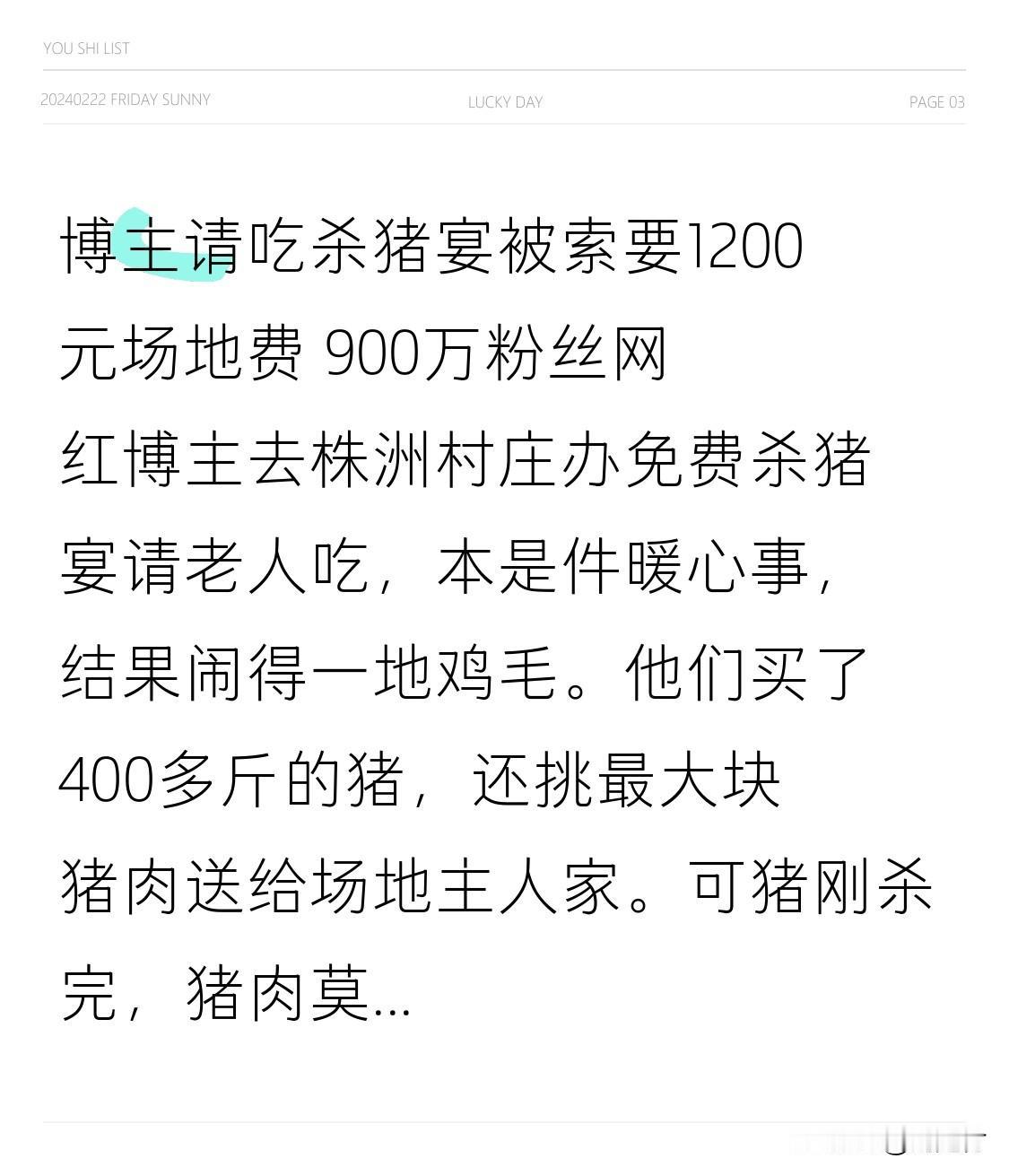 博主请吃杀猪宴被索要1200元场地费 900万粉丝网红博主赴株洲村庄办免费杀猪宴请老人,本是暖心之举,却闹得一地鸡毛。 博主买了400多斤的猪,还挑最大块猪肉送给场地主人家。然而猪刚杀完,猪肉莫名失踪,主人家随即翻脸,索要2000元场地费。双方一番拉扯后,博主付了1200元,但杀猪宴没办成,肉还被村民拿走。 此视频获赞超17万,评论转发超8万。原本博主想拍个热热闹闹的过年氛围短视频,没想到成了尴尬闹剧。 目前当地部门已介入调查,希望能给出公正结果,莫让好心被辜负。猪也落泪。