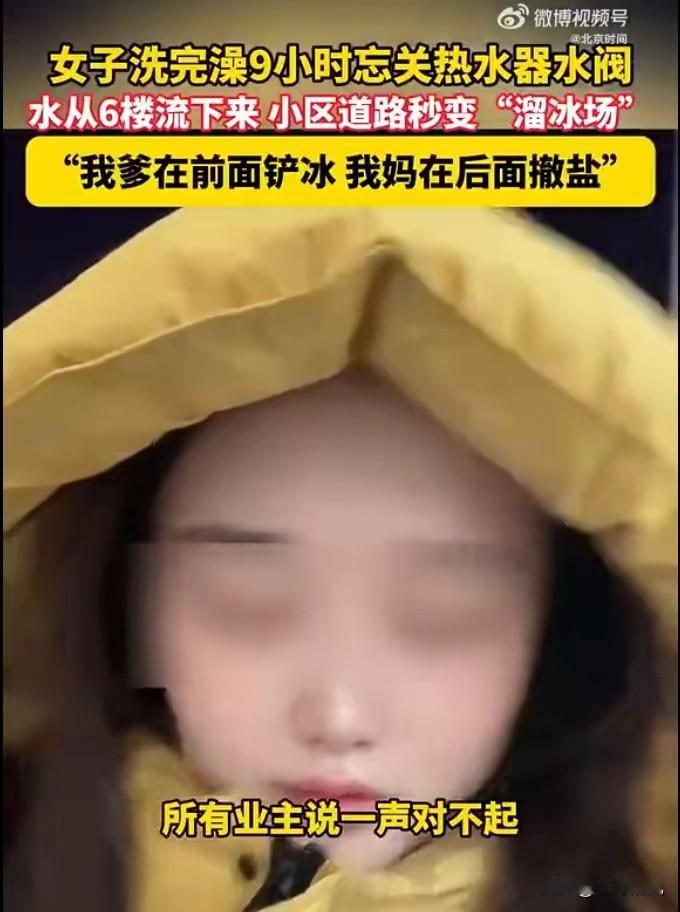 兰州一小区路面,一晚上变成了“溜冰场”。制造这“溜冰场”的始作俑者,是小区一位马大哈女子——晚上洗完澡忘了关热水器水阀,9个小时的水流从6楼的太阳能上倾泻而下,在寒夜里都冻成了冰。 女子爸爸发现后,第一时间叫上全家下楼补救,他在前面奋力铲冰,女子妈妈把小区小卖部的盐都买光了,跟在后面撒盐。一家人弯着腰忙了一上午,把路面上的冻冰全部铲除清理干净,对小区居民造成的不便,心里满是愧疚。 大家对此事怎么看?