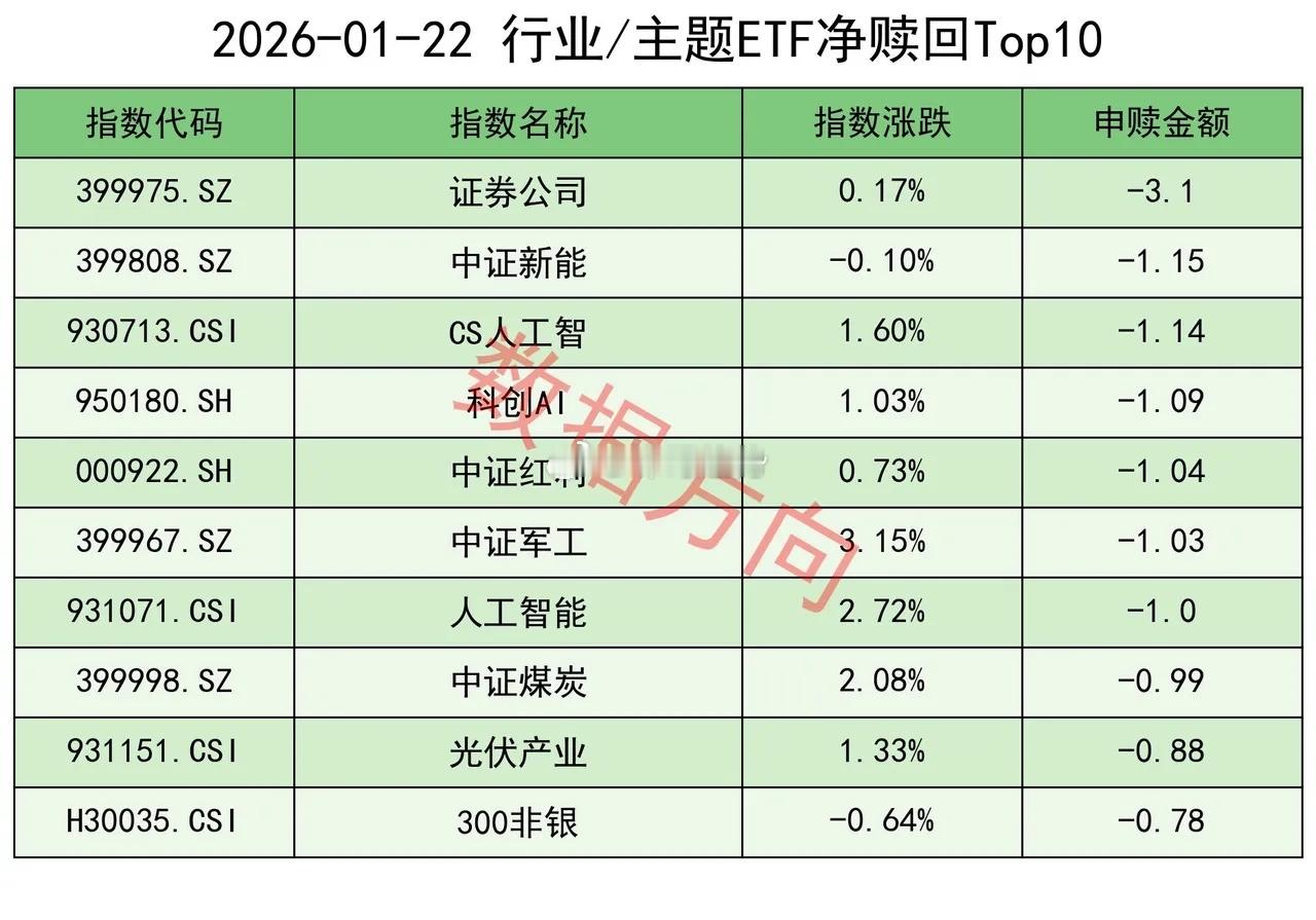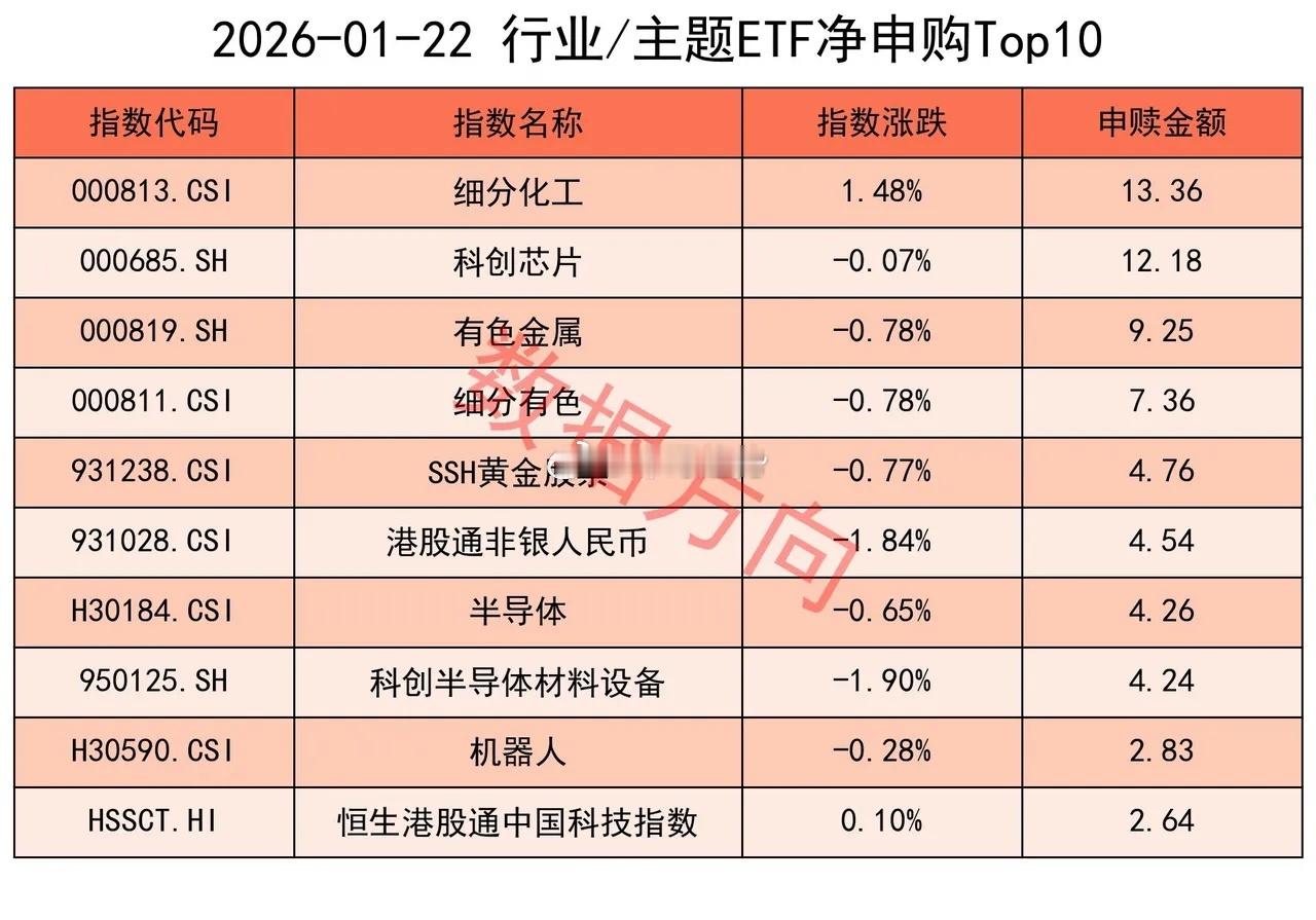 毫不手软,大卖3400亿1月22日星期四,大盘震荡后收阳,商业航天、建材、油气涨幅居前。上证指数涨幅0.14%,上交所ETF合计净赎回511.87亿元。1层态度坚决,这是其连续第6天大幅净赎回,6天以来累计净赎回3435.69亿,在过去,很多时候一年也申购不了这么多。好在市场交投活跃,仍然保持了2.7万亿的日成交额,指数的权重股暂时不好去,资金转而流入一些小盘股,于是带来一些结构性机会。这种成交额不知道还能保持多久,一旦难以为继,可能就真的要调整了。宽指仅有科创创业50指数(0.05亿)、中证A50指数(0.05亿),获小幅净申购,几乎可以忽略不计。沪深300指数(-404.78亿),净赎回超过400亿。中证1000指数(-97.38亿)、上证50指数(-52.24亿),净赎回都在50亿之上。中证A500指数(-16.86亿)、科创50指数(-9.14亿)、科创100指数(-5.0亿),净赎回都在5亿之上。中证500指数(-1.5亿)、上证180指数(-0.21亿)、上证指数(-0.18亿),分别被小幅净赎回。行业和主题 细分化工指数(13.36亿)、有色金属指数(9.25亿)、细分有色指数(7.36亿)、SSH黄金股票指数(4.76亿),一起进入申购榜。科创芯片指数(12.18亿)、半导体指数(4.26亿)、科创半导体材料设备指数(4.24亿),一起进入申购榜。港股通非银人民币指数(4.54亿)进入申购榜;证券公司指数(-3.1亿)、300非银指数(-0.78亿),一起进入赎回榜。其他进入申购榜的还有:机器人指数(2.83亿)、恒生港股通中国科技指数(2.64亿)。中证新能指数(-1.15亿)、光伏产业指数(-0.88亿),一起进入赎回榜。CS人工智指数(-1.14亿)、科创AI指数(-1.09亿)、人工智能指数(-1.0亿),一起进入赎回榜。其他进入赎回榜的还有:中证红利指数(-1.04亿)、中证军工指数(-1.03亿)、中证煤炭指数(-0.99亿)。ETF女子用开水浇他人车玻璃测试会否炸裂