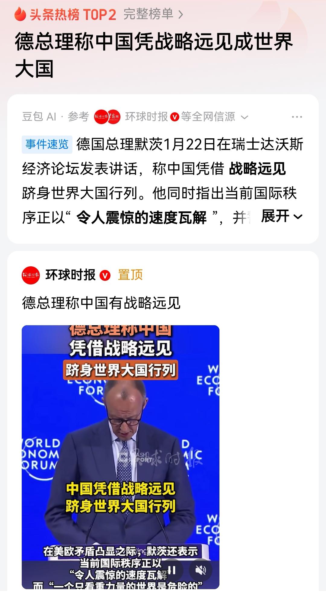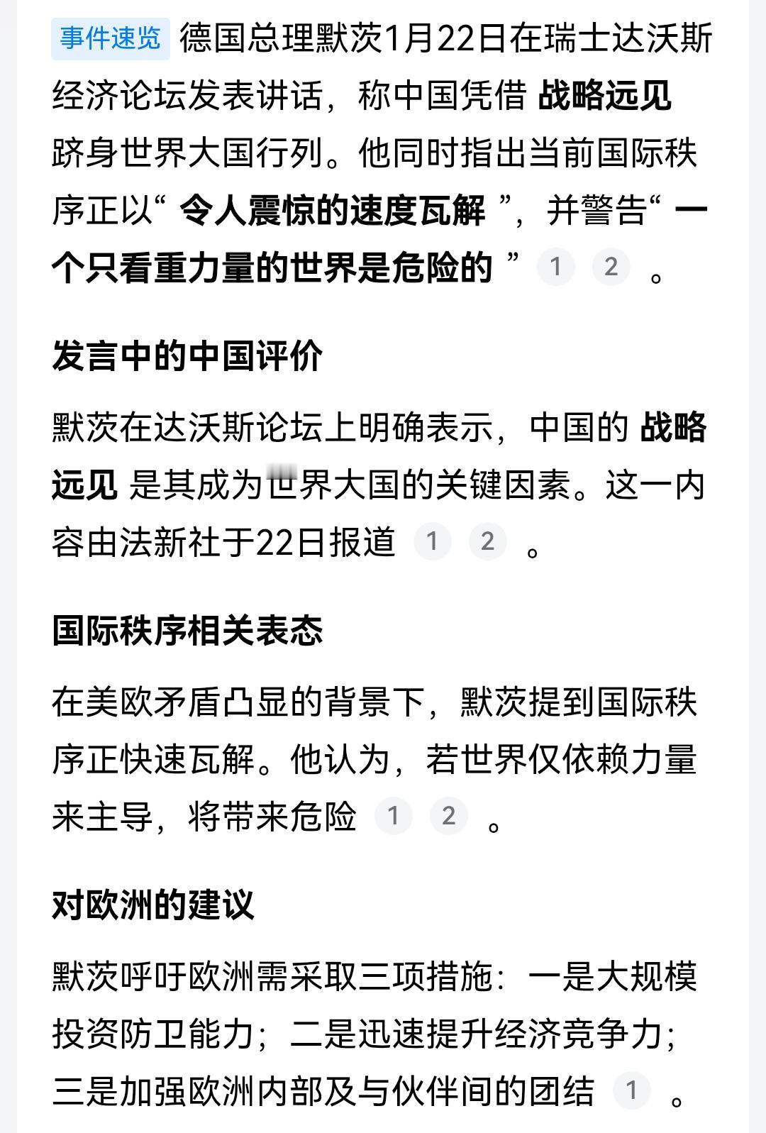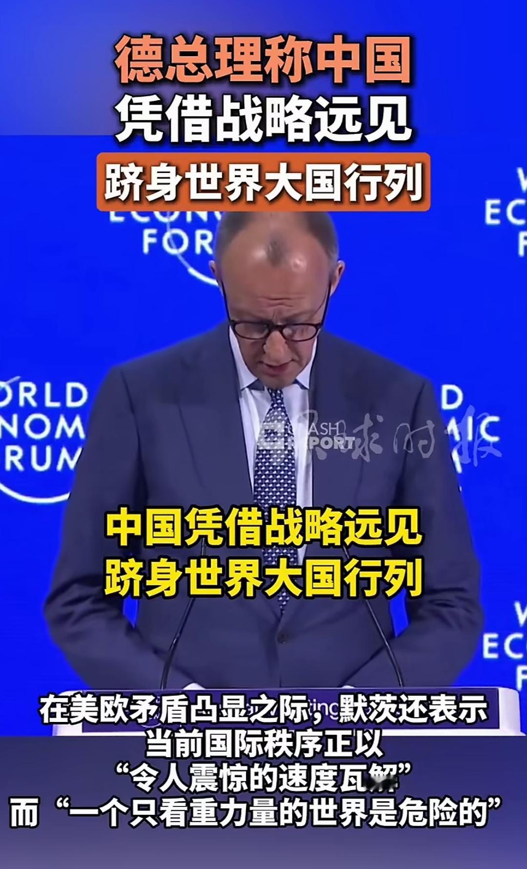 中国的战略远见,竟然被他发现了 据相关媒体22日报道,德国总理认为中国凭借战略远见,跻身世界大国行列。 先是引用中国的发展之道,后又指出当今国际秩序的不稳定,并且做出危险预警。 呼吁欧洲国家,要增加防卫力量,提高经济,内部要团结。 我认为,面对国际形势的复杂变化,不仅欧洲要团结,亚洲和全世界也应该团结起来,共同守护联合国的合法权益。 让这个世界,和平稳定的发展。