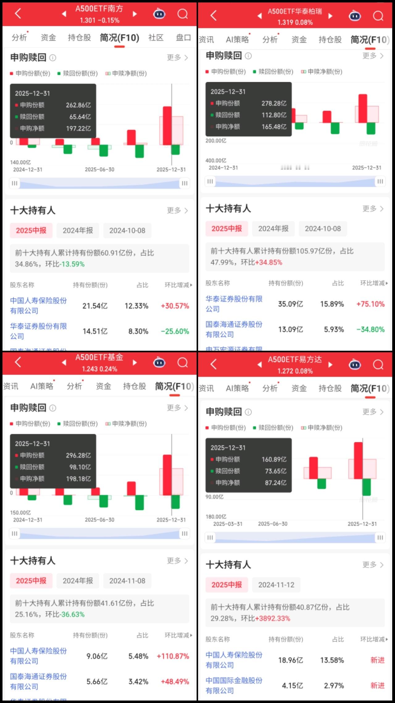 几只沪深300etf开年后被连续净赎回这事本来是不想聊的,但一直有朋友问,加上听到市场上越来越离谱的声音,还是写一点客观的数据吧。1、汇金和汇金资管是什么时候开始增持的沪深300?以规模最大的一只etf为例吧,从很多年前一直到2023年6月底,汇金持有份额一直未有变动:24.24亿份。2023年下半年,汇金由24.24亿增持到了62亿份。2024年上半年,汇金由62.47亿增持到了356亿份。2024年下半年,汇金停止增持,汇金资管新入增持了266亿份。2025年上半年,汇金资管由266亿份增持到了378亿份。2023年7月—2024年7月,汇金熊市增持。(引导资金入市)2024年7月—2025年7月,汇金资管牛市初期增持。(巩固市场稳定)2、汇金和汇金资管为什么要入市增持沪深300etf?首先结合当时的背景,下行周期人人谈A色变,需要这笔资金起到类平准基金的作用:注入流动性+稳定预期。至于借道etf而不是直接注资到的个股,也是为了避免个股的争议(手动狗头)。从23年7月-25年7月不完全统计,汇金和汇金资管,以借道沪深300etf的方式,对A股形成了1万亿级别净增持规模,分别起到了引导资金入市、巩固市场稳定的作用。3、如今汇金赎回近1000亿,是不看好A股吗?这个问题其实本身就是不成立的,你要理解一个概念,【汇金之于A股,并非投资者层面,而是管理者层面。汇金和证金的主要作用,是维护国家金融资产的稳定。】他的申购和赎回,都是为了稳定市场,只是发生在不同时期不同背景下的不同选择。回看熊市时,那么多优质低价筹码,但都在割肉几乎没人买,反而是国家队出手救市,申购是稳定市场;回看当下牛市,十倍妖股,两三千倍市梦率,依然一堆疯狂涌入的资金。所以现在赎回也是在稳定市场。【这也是我前几年提到过的,A股的考验,不是会不会有牛市?因为一定会有牛市。而真正的考验是这一次牛市后,A股的选择能否区别于过去二十年的其他牛市。因为牛市后的表现才决定了居民财富和北上资金能否持续稳定的流入证券市场。】4、净赎回的钱离开这个市场了吗?并没有,在2025年7月后,在沪深300出现净赎回的同时A500是大规模净增持的。同样现在年报还没有出来,你可以看下目前几只A500etf的大股东都还是人寿。而年报出来后,第一大股东一定也会变成汇金/汇金资管。ps:其实这一万亿的沪深300净增持从投资角度去看是吃亏的,因为盈利大概只有20%甚至不到。如果只是为了盈利,同期的其他宽指etf有很多翻倍的,只是沪深300的承载力更强,才选择了借道沪深300。而如今这部分熊市的逆势增持,一部分完成了其最初的作用,一部分也将投入于新的指数中去。