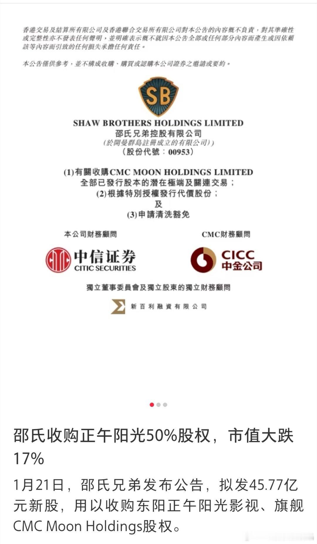 邵氏收购正午阳光,应该相当于CMC借壳上市了。