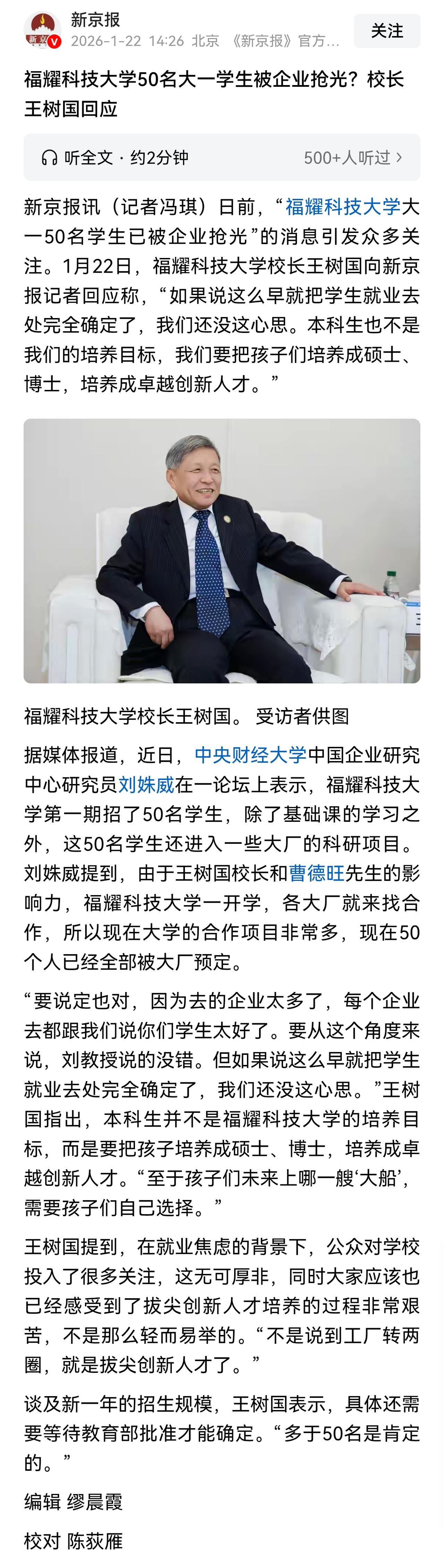 王树国校长的回应是对的。如果福耀科技大学办学追求的就是学生本科毕业就业,那福耀科技大学可以不办了。上福耀科技大学的学生,如果盯着四年后的就业,也不必选择福耀科技大学。这是和福耀科技大学要举办为新型研究型大学的定位不符合的。就如北大、清华,如果学生进校考虑的是本科毕业后的就业,那北大、清华就变为了职业培训所。